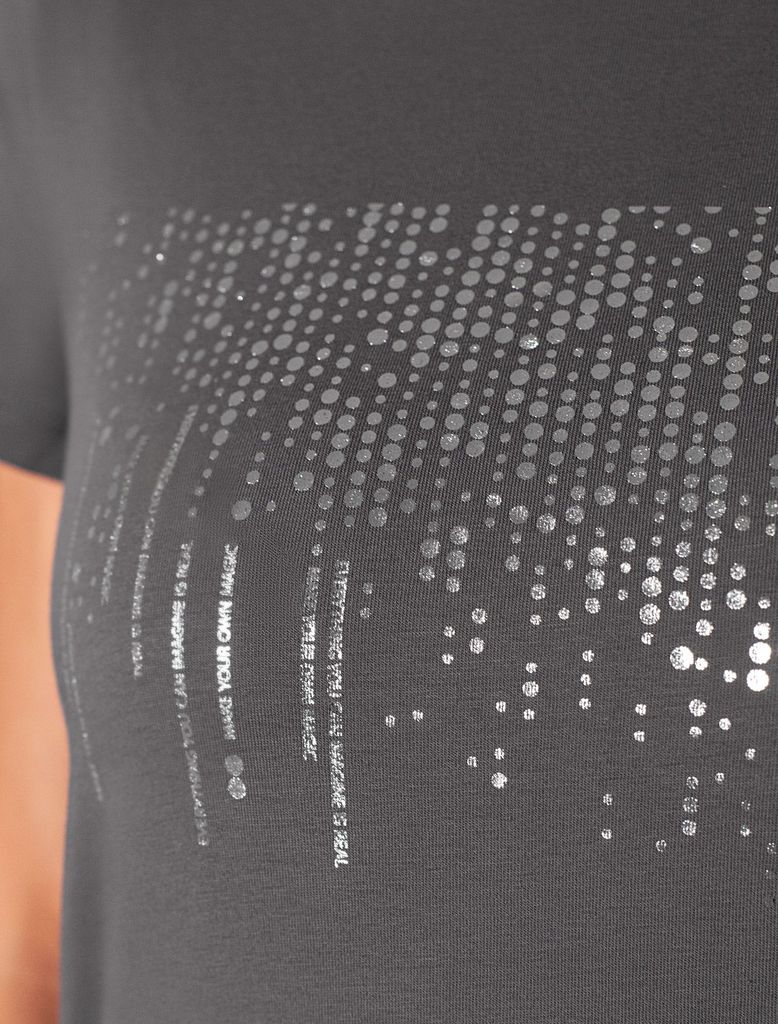 Состав: 92%Хлопок 8%ПУ Плотность: 170 Г/м2 Стильная базовая футболка темно-серого цвета с серебристым принтом устойчивами красками выполнена из плотного хлопка с эластаном для комфортной посадки на лю... Показать описаниебую фигуру. Прямая футболка классического кроя с круглым вырезом, прекрасно подходит для разных типов фигуры, в том числе и на большие размеры. Мягкость хлопка вместе с небольшой долей эластана гарантирует идеальную посадку и свободу движений. Легкая натуральная дышащая ткань премиального качества делает футболку с коротким рукавом идеальным вариантом для повседневной носки дома, на работу или офис. Однотонная футболка дополнена авторским аккуратным принтом, который придает праздничный и элегантный вид без лишней вычурности. Блестящий принт в виде дождика аккуратно украшает, добавляя изысканный акцент и создавая легкий мерцающий эффект. Эта эффектная футболка станет отличным выбором на праздник, подчеркивая образ сияющей и уверенной в себе девушки или женщины. Если вы ищете комфортный и одновременно привлекательный наряд для особых моментов, эта футболка станет надежным решением, подчеркивающим вашу индивидуальность и вкус.