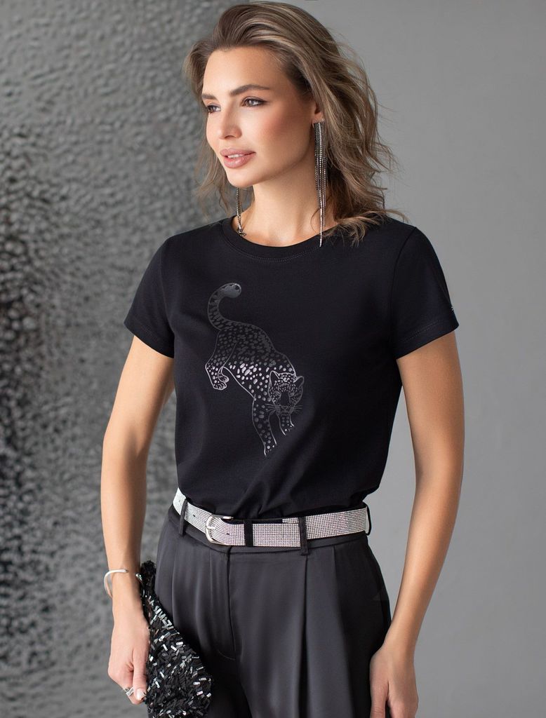 Состав: 92%Хлопок 8%ПУ Плотность: 170 Г/м2 Стильная базовая футболка черного цвета с серебристым принтом устойчивыми красками выполнена из плотного хлопка с эластаном для комфортной посадки на любую ф... Показать описаниеигуру. Прямая футболка классического кроя с круглым вырезом, прекрасно подходит для разных типов фигуры, в том числе и на большие размеры. Мягкость хлопка вместе с небольшой долей эластана гарантирует идеальную посадку и свободу движений. Легкая натуральная дышащая ткань премиального качества делает футболку с коротким рукавом идеальным вариантом для повседневной носки дома, на работу или офис. Однотонная футболка дополнена авторским аккуратным принтом с изображением леопарда, который придает праздничный и элегантный вид без лишней вычурности. Блестящий анималистичный принт аккуратно украшает, добавляя изысканный акцент и создавая легкий мерцающий эффект. Эта эффектная футболка станет отличным выбором на праздник, подчеркивая образ сияющей и уверенной в себе девушки или женщины. Если вы ищете комфортный и одновременно привлекательный наряд для особых моментов, эта футболка станет надежным решением, подчеркивающим вашу индивидуальность и вкус.