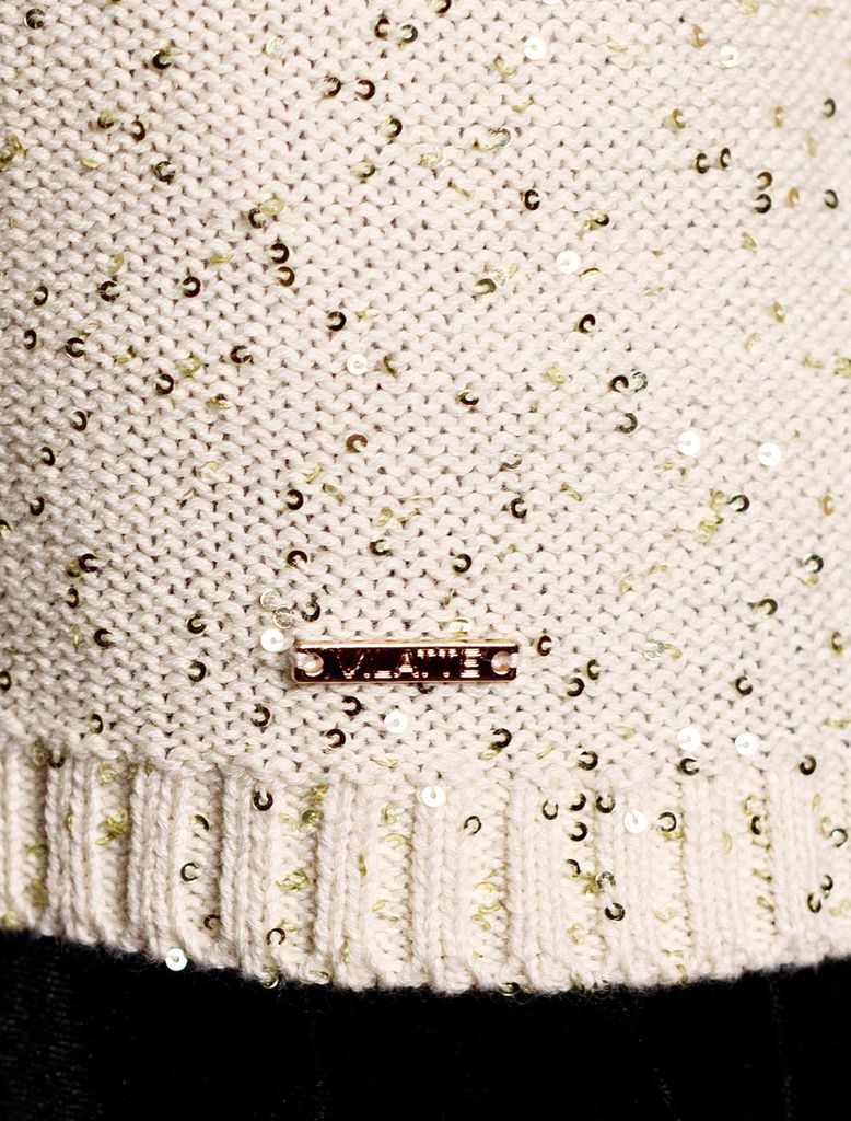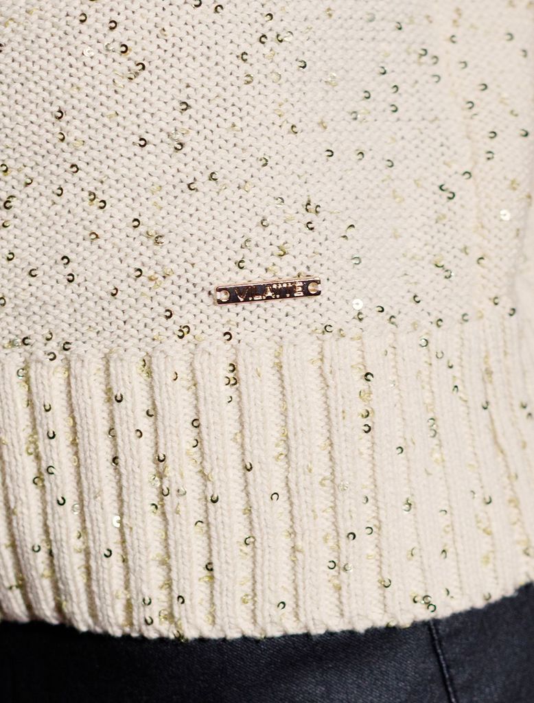 Состав: 90%Хлопок 10%ПЭ Плотность: 5 GG Легкий джемпер бежевого цвета с V вырезом и коротким рукавом выполнен из хлопковой пряжи с вкраплением сияющих пайеток, что придает особую изысканность. Нарядны... Показать описанией джемпер связан изнанкой, пряжа отличается легкостью и приятной текстурой, совершенно не колется, обеспечивает комфорт даже при длительном использовании, а натуральные волокна поддерживают оптимальный температурный баланс. Полуприлегающий крой подчеркивает женственный силуэт, а манжеты на рукавах и по низу гармонично завершают дизайн, создающий аккуратный образ. Умеренно открытое декольте вытягивает шею и подчеркивает ее изящество. Стильный джемпер подойдет девушкам и женщинам больших размеров, в нем вы будете чувствовать себя уверенно и свободно в любой ситуации. Мерцающий эффект пайеток добавляет образу выразительности и индивудуальности. Сочетайте джемпер в романтическом образе с пышной юбкой, в более строгом с широкими брюками. Мерцающее полотно добавляет особого шарма вашему образу, делая его уместным как на праздник, так и для повседневного выхода. Новый год, вечеринка или любое другое мероприятие пройдут ярко — сияющие пайетки создают ощущение праздника в каждом движении.