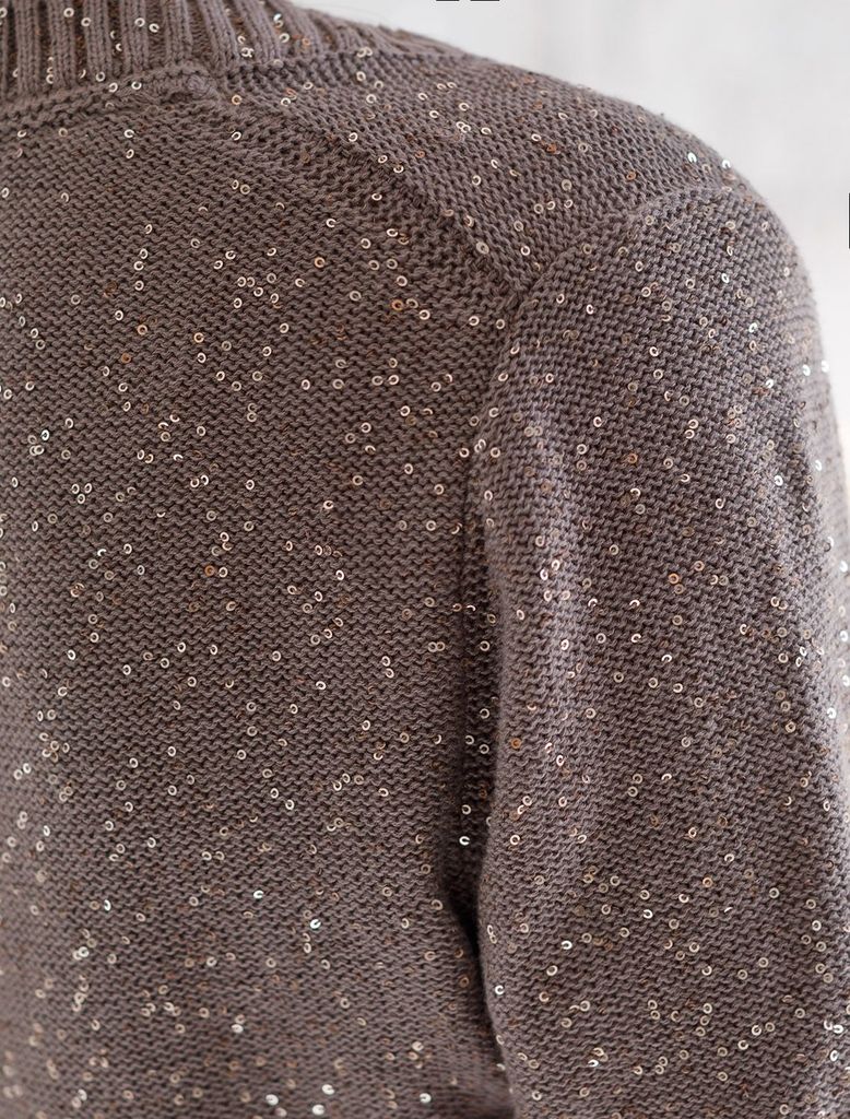 Состав: 90%Хлопок 10%ПЭ Плотность: 5 GG Легкий джемпер кофейного цвета с цельнокроенным коротким руковом выполнен из хлопковой пряжи с вкраплением сияющих пайеток, что придает особую изысканность. Сти... Показать описаниельный джемпер связан изнанкой, пряжа отличается легкостью и приятной текстурой, совершенно не колется, обеспечивает комфорт даже при длительном использовании, а натуральные волокна поддерживают оптимальный температурный баланс. Свободный крой и цельнокроенный рукав создают расслабленный, но аккуратный образ. Нарядный джемпер подойдет девушкам и женщинам больших размеров, в нем вы будете чувствовать себя уверенно и свободно в любой ситуации. Мерцающий эффект пайеток добавляет образу выразительности и индивидуальности. Мерцающее полотно добавляет особого шарма вашему образу, делая его уместным как на праздник, так и для повседневного выхода. Новый год, вечеринка или любое другое мероприятие пройдут ярко — сияющие пайетки создают ощущение праздника в каждом движении. Для спокойного повседневного аутфита добавьте к этому эффектному джемперу спокойный низ, близкий по цвету, без дополнительных элементов декора.