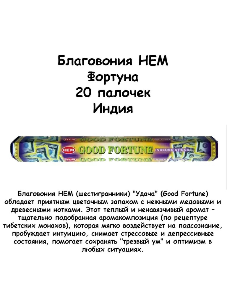 Благовоние Good luck Удача от Hem - специально подобранная комбинаций индийских трав, которые притягивают благоприятную энергию успеха и благополучия. В Индии приманивали удачу, воскуривая ароматные с... Показать описаниемеси. Считается, что аромат специальных трав очищает пространство от негатива и энергетических следов недоброжелателей и открывает путь для энергий процветания. Способ применения: надежно закрепляйте тлеющее благовоние вдали от легко воспламеняющихся предметов. Противопоказания: повышенная чувствительность к запахам, возраст менее трех лет. Не рекомендована ароматерапия благовониями в период беременности и грудного вскармливания. Состав: бамбук основа, композиция из масел и смеси индийских трав и специй, уголь.