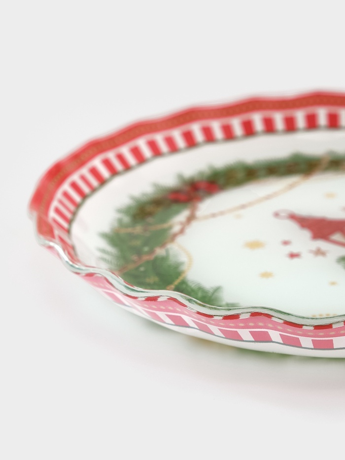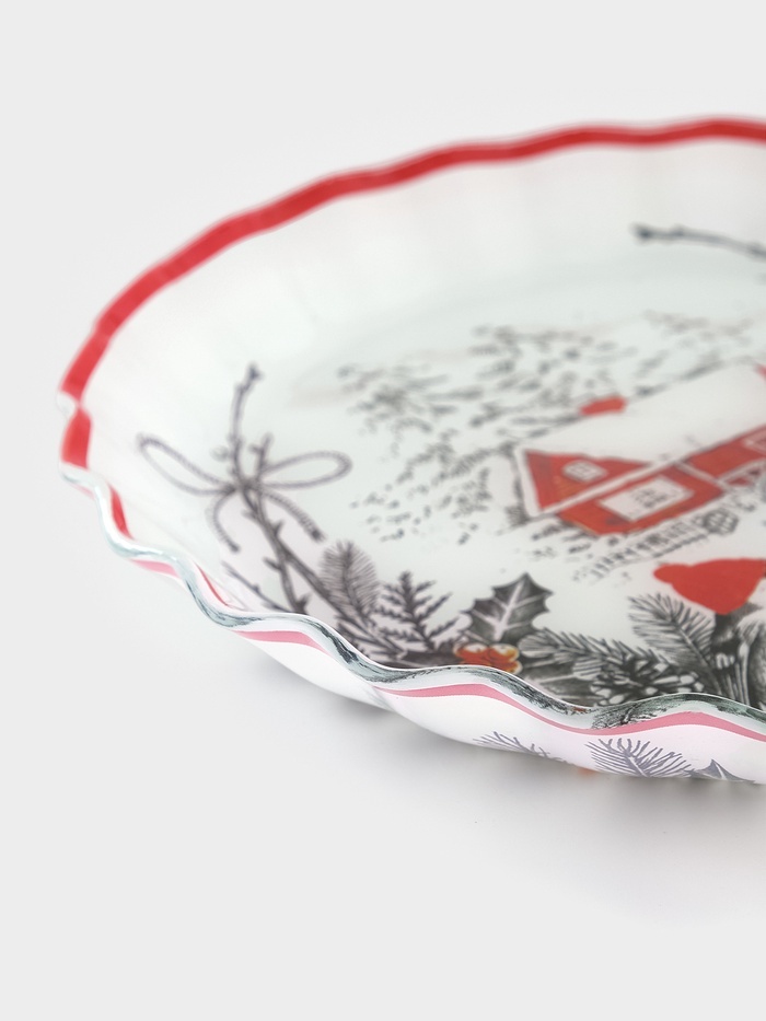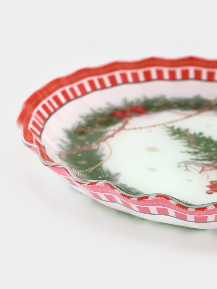 Сервировка, от которой невозможно отвести взгляд! Сервировочное блюдо — яркий, но сдержанный акцент для новогоднего и рождественского стола. Разноцветный рисунок на белом стекле создаёт атмосферу праз... Показать описаниедника без излишней пестроты и подходит как для закусок, так и для десертов. Особенности: * Новогодняя тематика: рисунок передаёт волшебство зимних праздников — узоры, гирлянды, сказочные мотивы — но не содержит символов конкретного года. Блюдо останется актуальным в течение многих сезонов. * Разноцветный рисунок на белом стекле: яркие детали оживают на нейтральном фоне, не перегружая сервировку. Такое блюдо легко сочетается с белой посудой, деревянными подставками и текстилем в природной гамме. * Диаметр 25 см: размер подходит для нарезки сыра, фруктов, канапе или мини-десертов. Это сервировочное блюдо — не просто посуда, а элемент праздничного оформления. Оно уместно на новогоднем ужине, рождественском обеде или зимнем фуршете. Пусть даже простая закуска заиграет волшебством. Дополнительно Нельзя мыть в посудомоечной машине и использовать в СВЧ-печи. Рекомендуется мыть только вручную без агрессивных моющих средств.
