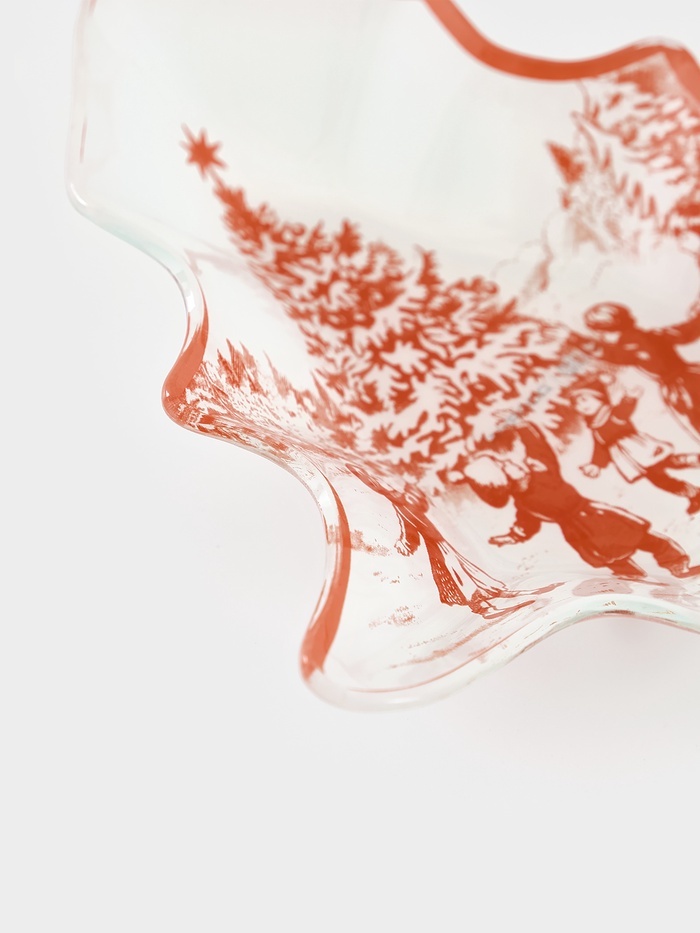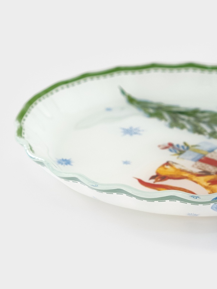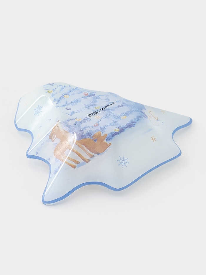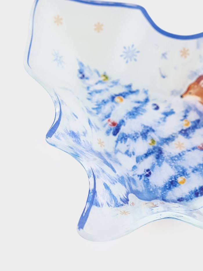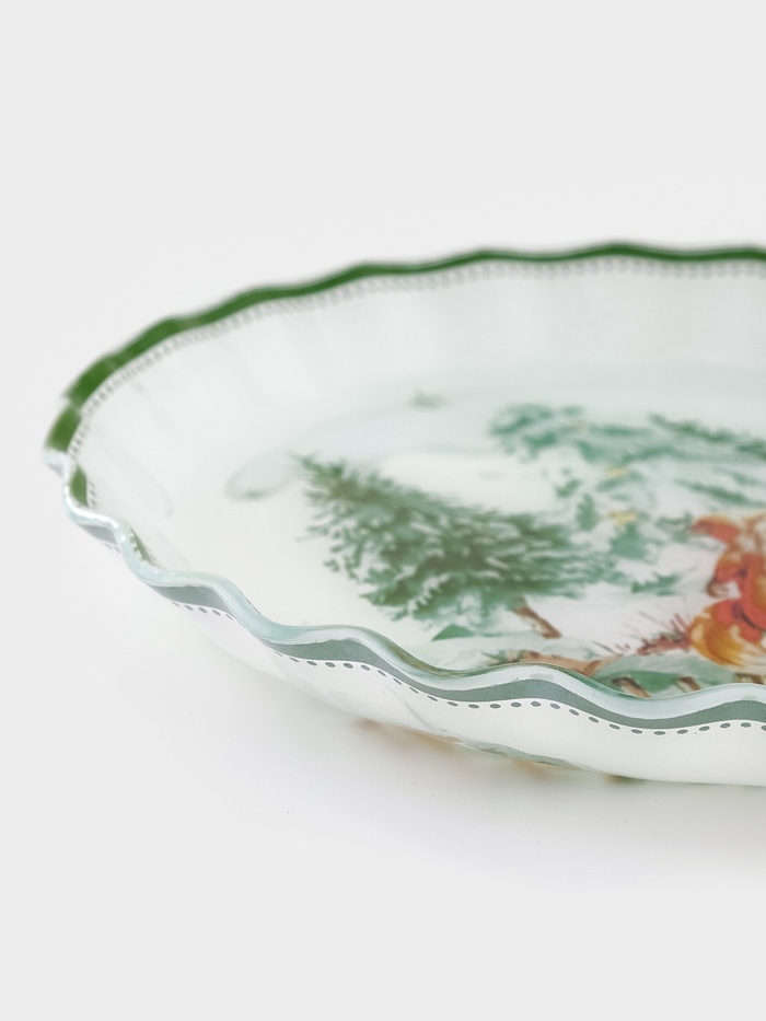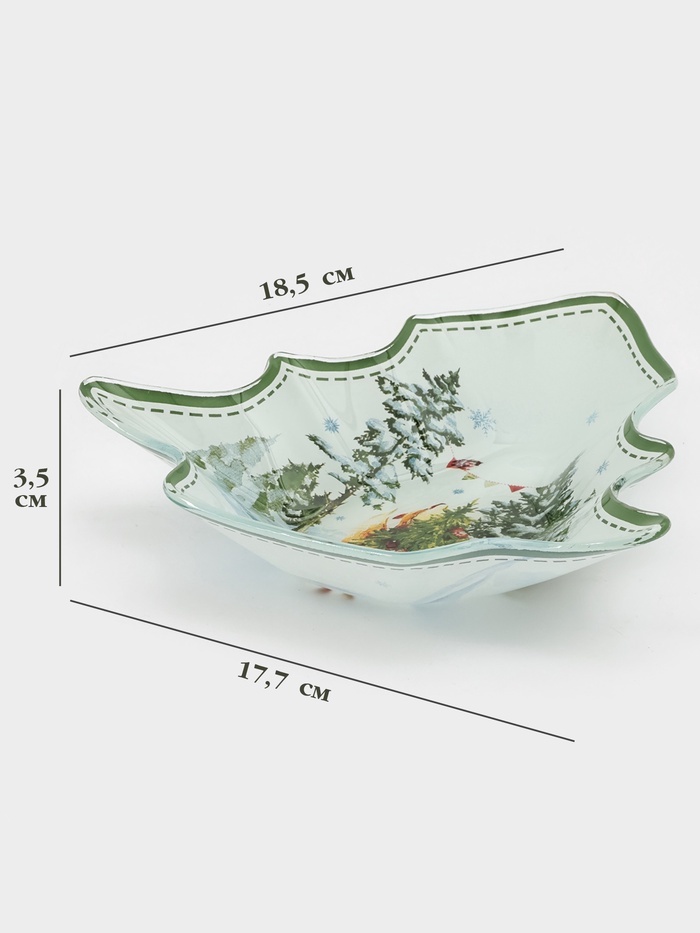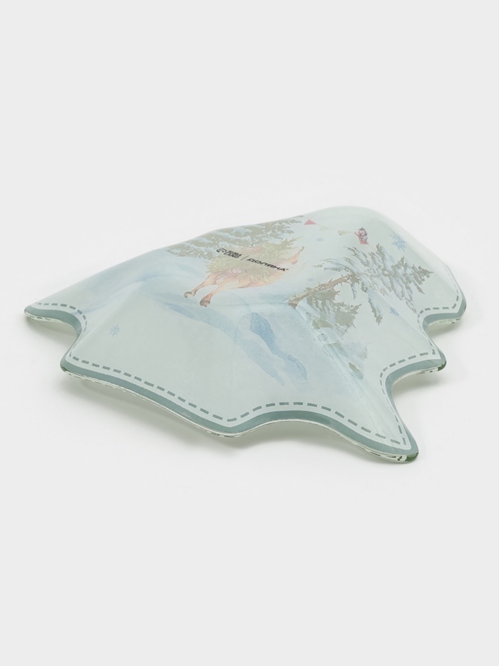Праздник — в деталях, а уют — в лесных мотивах! Сервировочное блюдо — это фигурное стеклянное блюдо с новогодним рисунком в бело-зелёной палитре. Оно сочетает функциональность и декоративность, превра... Показать описаниещая подачу угощений в часть праздничного оформления. Особенности: * Фигурный силуэт: нестандартная форма подчёркивает тематику рисунка — лес и его обитатели. Такое блюдо не теряется на столе, а становится акцентом, даже если на нём просто лежат мини-десерты или орехи. * Новогодняя тематика: рисунок с зверьками выполнен в белом и зелёном — цветах, которые сразу вызывают ассоциации с хвойным лесом и снегом. * Качественное стекло: гладкая текстура не отвлекает от содержимого и рисунка. Материал добавляет воздушности столу и легко сочетается с другими элементами посуды — от деревянных подносов до фарфоровых тарелок. * Для бережного обращения: блюдо не предназначено для СВЧ и посудомоечных машин. Оно рассчитано на ручной уход. Выбор для атмосферного новогоднего стола Это блюдо подойдёт к Рождеству, Новому году или зимнему семейному ужину. Добавьте к своей сервировке праздника — и пусть даже простая закуска расскажет историю зимнего уюта. Дополнительно Нельзя мыть в посудомоечной машине и использовать в СВЧ-печи. Рекомендуется мыть только вручную без использования агрессивных моющих средств.