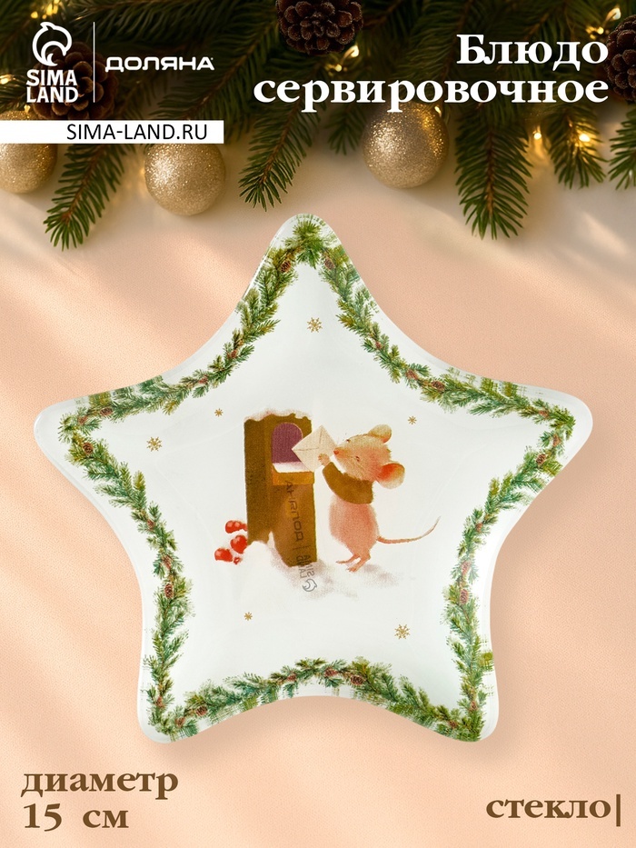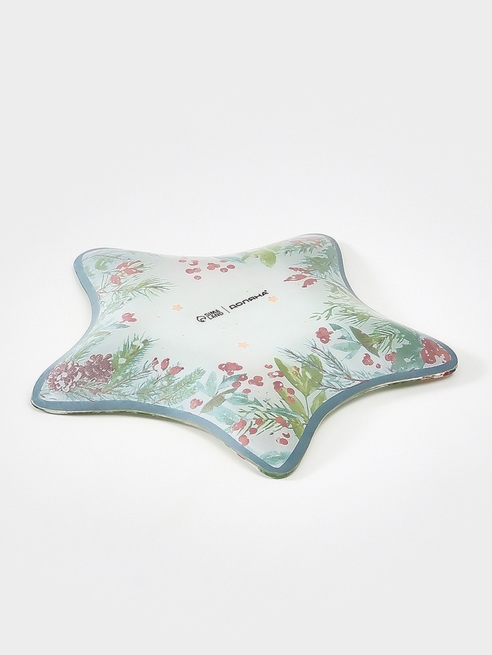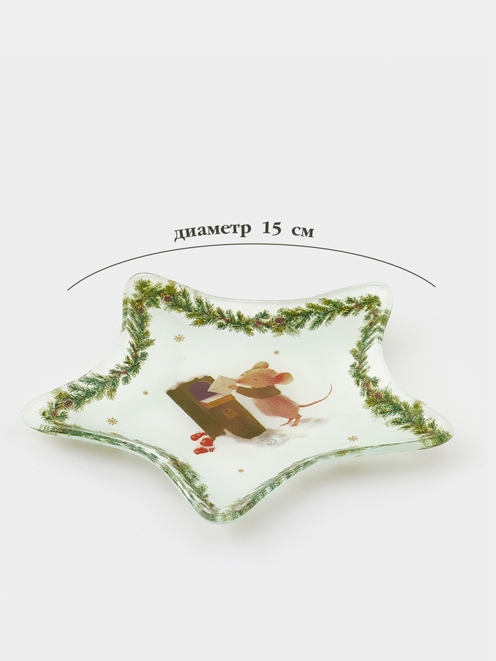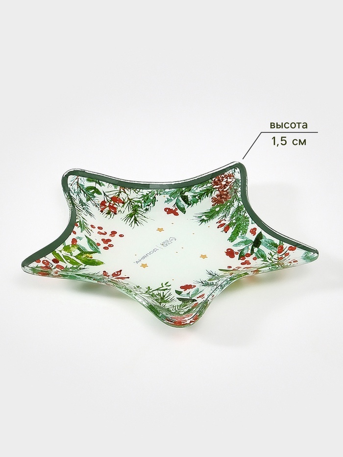 Маленькая звезда — большой праздничный штрих! Сервировочное блюдо — стеклянная тарелка в форме звезды диаметром 15 см с новогодним рисунком в бело-зелёной гамме. Оно подходит для подачи мини-закусок, ... Показать описаниеконфет или как самостоятельный декоративный элемент на праздничном столе. Особенности: * Форма-звезда с зимним мотивом: контур в виде звезды сочетается с изображением еловых ветвей — классического символа новогоднего уюта. Такая форма привлекает внимание, не занимая много места, и легко вписывается даже в плотную сервировку. * Бело-зелёная праздничная палитра: цвета передают атмосферу хвойного леса под снегом. Рисунок лаконичен, не перегружает поверхность и оставляет достаточно места для угощений. * Качественное стекло: гладкая прозрачная основа подчёркивает содержимое и не конфликтует с другими элементами сервировки. * Для бережного использования: блюдо не предназначено для СВЧ и посудомоечных машин. Оно рассчитано на ручной уход — как часть продуманной праздничной сервировки, где важна каждая деталь. Универсальный элемент новогоднего стола Это блюдо подойдёт для Нового года, Рождества или зимнего фуршета. Положите на него имбирные пряники, мини-канапе или просто оставьте как украшение — и пусть даже небольшое блюдо станет частью праздничного волшебства. Дополнительно Нельзя мыть в посудомоечной машине и использовать в СВЧ-печи. Рекомендуется мыть только вручную без использования агрессивных моющих средств.