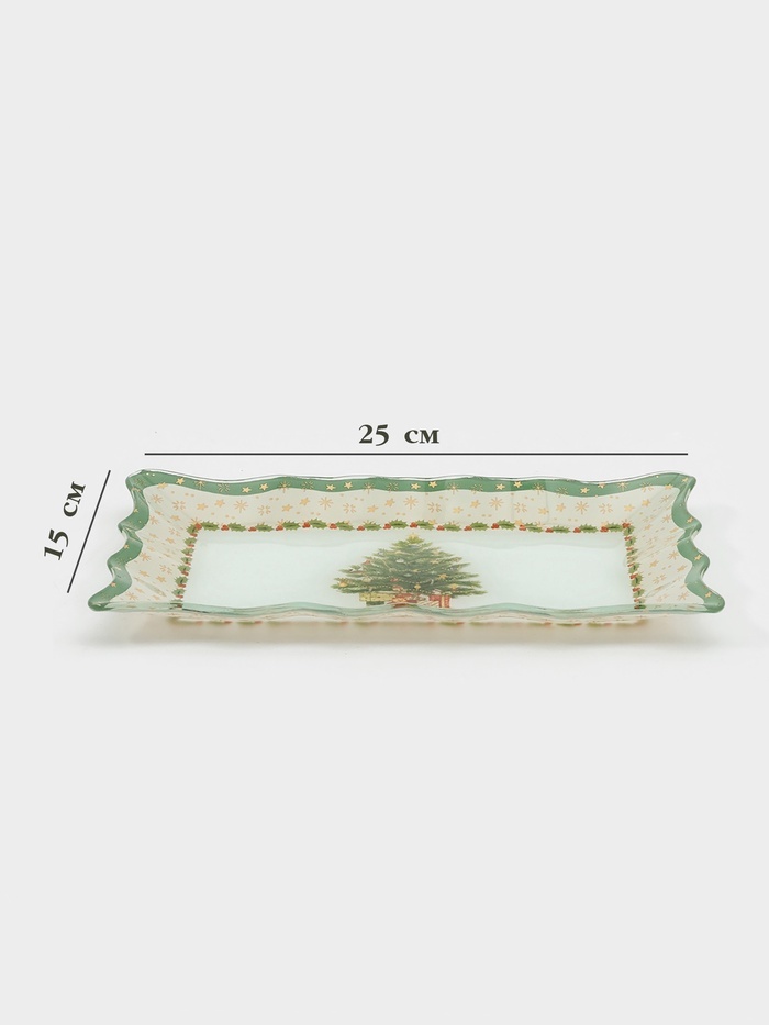 Пусть на столе заиграет зима! Сервировочное блюдо — это прямоугольная стеклянная основа с лаконичным новогодним рисунком в бело-зелёной гамме. Оно создано для подачи угощений и одновременно работает к... Показать описаниеак элемент праздничного декора. Особенности: * Рождественская тематика: изображение ёлки выполнено в белом и зелёном — классических тонах зимних праздников. * Удобный размер 25?15 см: прямоугольная форма и размер подходят для нарезок, канапе, мини-десертов и других закусок. Такое блюдо легко разместить на общем столе или использовать как самостоятельную подачу для гостей. * Качественное стекло: гладкая прозрачная поверхность не отвлекает от рисунка и содержимого. Она добавляет лёгкости сервировке и сочетается с любой столовой посудой — от фарфора до керамики. * Уход: изделие не рассчитано на СВЧ и посудомоечные машины. Оно предназначено для бережного использования — как часть продуманной праздничной сервировки, где каждая деталь имеет значение. Идея для новогоднего стола Блюдо подойдёт к Рождеству, Новому году или зимнему чаепитию. Добавьте его в сервировку — и пусть даже простая закуска станет частью праздника. Дополнительно Нельзя мыть в посудомоечной машине и использовать в СВЧ-печи. Рекомендуется мыть только вручную без использования агрессивных моющих средств.