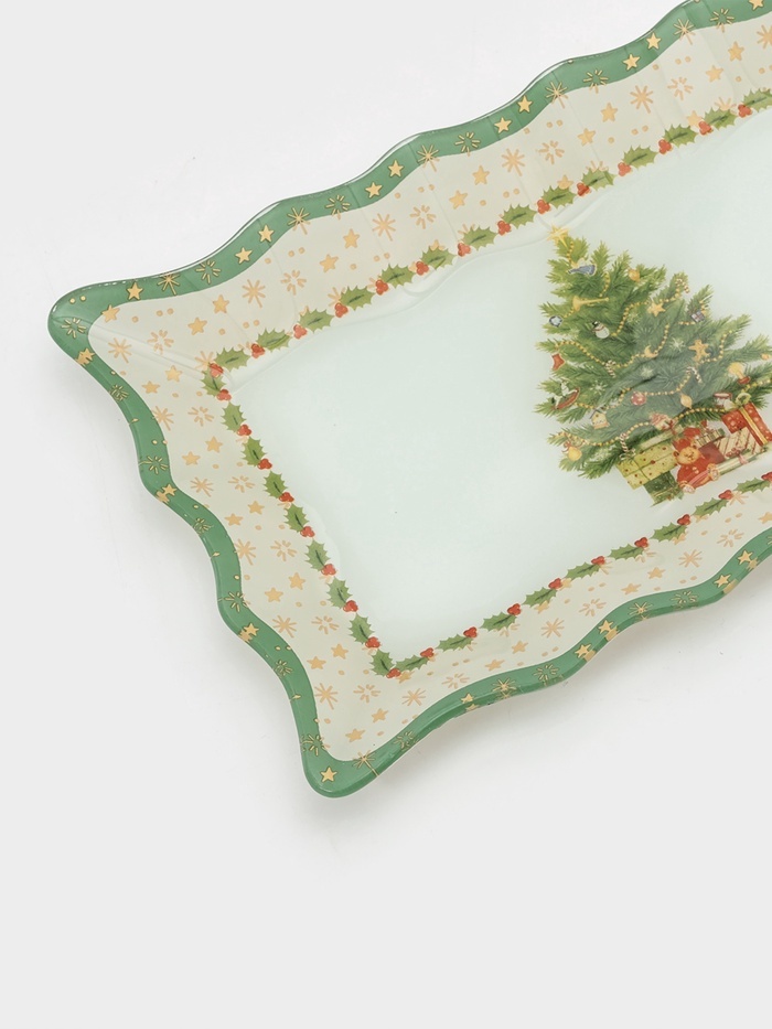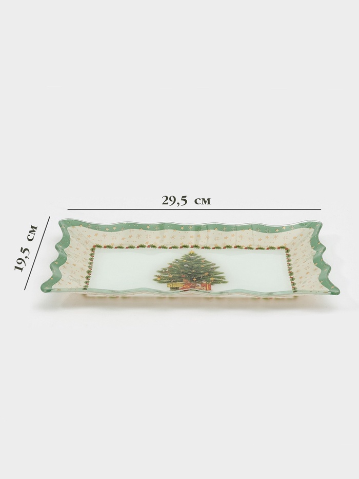 Пусть на столе заиграет зима! Сервировочное блюдо — это прямоугольная стеклянная основа с лаконичным новогодним рисунком в бело-зелёной гамме. Оно создано для подачи угощений и одновременно работает к... Показать описаниеак элемент праздничного декора. Особенности: * Рождественская тематика: изображение ёлки выполнено в белом и зелёном — классических тонах зимних праздников. * Удобный размер 29,5?19,5 см: прямоугольная форма и размер подходят для нарезок, канапе, мини-десертов и других закусок. Такое блюдо легко разместить на общем столе или использовать как самостоятельную подачу для гостей. * Качественное стекло: гладкая прозрачная поверхность не отвлекает от рисунка и содержимого. Она добавляет лёгкости сервировке и сочетается с любой столовой посудой — от фарфора до керамики. * Уход: изделие не рассчитано на СВЧ и посудомоечные машины. Оно предназначено для бережного использования — как часть продуманной праздничной сервировки, где каждая деталь имеет значение. Идея для новогоднего стола Блюдо подойдёт к Рождеству, Новому году или зимнему чаепитию. Добавьте его в сервировку — и пусть даже простая закуска станет частью праздника. Дополнительно Нельзя мыть в посудомоечной машине и использовать в СВЧ-печи. Рекомендуется мыть только вручную без использования агрессивных моющих средств.