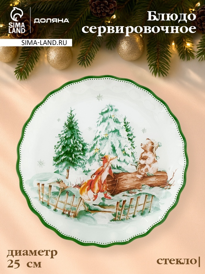 Блюдо новогоднее сервировочное Доляна «Зверьки в лесу», d=25 см, стекло, белое, зелёноеВопросы по товару