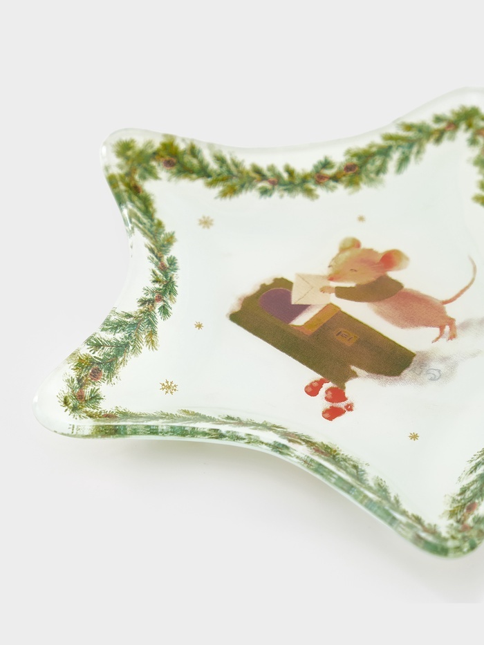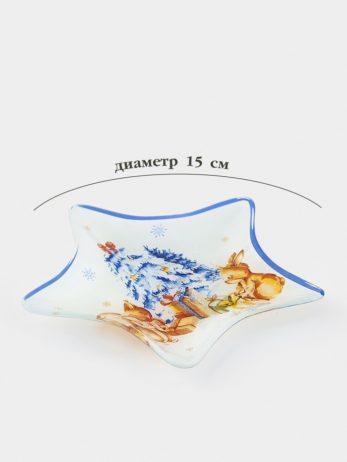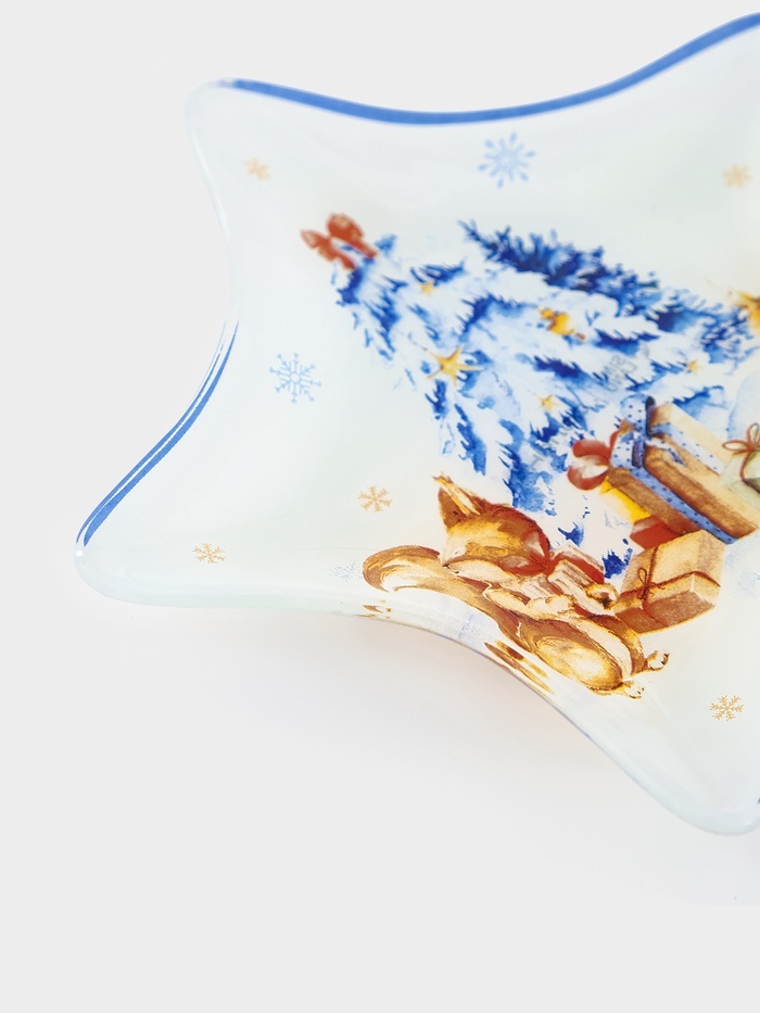 Праздник — в деталях, а уют — в лесных мотивах! Сервировочное блюдо — это фигурное стеклянное блюдо с новогодним рисунком в бело-зелёной палитре. Оно сочетает функциональность и декоративность, превра... Показать описаниещая подачу угощений в часть праздничного оформления. Особенности: * Фигурный силуэт: форма звезды подчёркивает тематику праздника и уюта. * Новогодняя тематика: рисунок с зверьками выполнен в белом и зелёном — цветах, которые сразу вызывают ассоциации с хвойным лесом и снегом. * Качественное стекло: гладкая текстура не отвлекает от содержимого и рисунка. Материал добавляет воздушности столу и легко сочетается с другими элементами посуды — от деревянных подносов до фарфоровых тарелок. * Для бережного обращения: блюдо не предназначено для СВЧ и посудомоечных машин. Оно рассчитано на ручной уход. Выбор для атмосферного новогоднего стола Это блюдо подойдёт к Рождеству, Новому году или зимнему семейному ужину. Дополнительно Нельзя мыть в посудомоечной машине и использовать в СВЧ-печи. Рекомендуется мыть только вручную без использования агрессивных моющих средств.