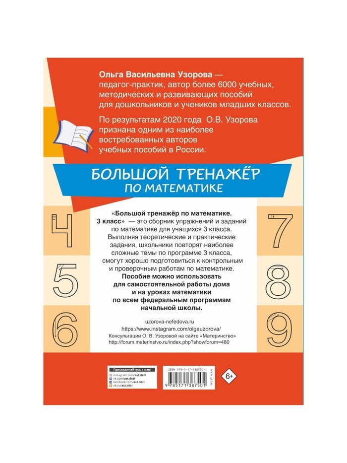 Тренажёр «Математика для третьего класса» — это сборник упражнений, который поможет ученикам уверенно освоить программу математики. Авторы Ольга Узорова и Елена Нефёдова создали пособие, включающее те... Показать описаниеоретические и практические задания, которые закрепляют ключевые темы курса. Это универсальный инструмент для подготовки к контрольным работам, выполнения домашних заданий и самостоятельных занятий дома или в классе. Особенности * 80 страниц с разнообразными заданиями, направленными на повторение и закрепление материала. * Мягкий переплёт делает тренажёр удобным для использования как дома, так и на уроках. * Авторы предлагают задания, которые помогают справиться с наиболее сложными темами программы третьего класса. * Подходит для детей от 6 лет, помогая развивать логическое мышление и навыки решения задач. * Пособие можно использовать для работы по всем федеральным программам начальной школы. Учимся решать с уверенностью Этот тренажёр напоминает путеводитель по миру чисел, где каждое задание — это новый шаг к пониманию математики. Ребёнок словно становится исследователем, который открывает для себя законы вычислений и решает задачи, словно разгадывает загадки. Это похоже на строительство моста: каждый пример добавляет прочности конструкции, делая её всё более надёжной. «Математика для третьего класса» — это не просто учебное пособие, а инструмент для развития. Она учит ребёнка быть внимательным, находить ответы самостоятельно и верить в свои силы. Отличный выбор для тех, кто хочет сделать процесс обучения математике эффективным и результативным! Идеально подходит для занятий дома, на уроках или в дополнительных группах. Помогает родителям и учителям создать прочную базу для успешного обучения ребёнка. С этим тренажёром каждый ученик сможет развивать логическое мышление и уверенность в своих знаниях, шаг за шагом приближаясь к цели. Дополнительно Все книги автора Нефедова Елена Алексеевна, Узорова Ольга Васильевна.Формат страниц: 215х285x4.9мм