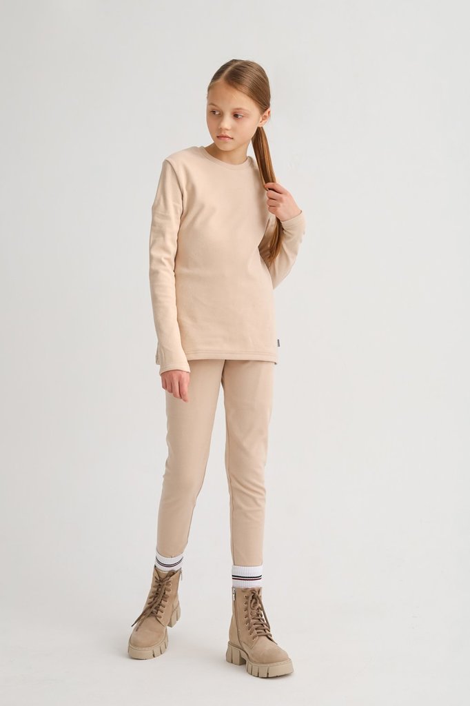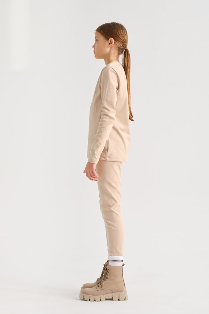 Нежная на ощупь ткань. Плотное облегание. Лонгслив с округлым вырезом горловины. Легинсы с поясом на резинке.