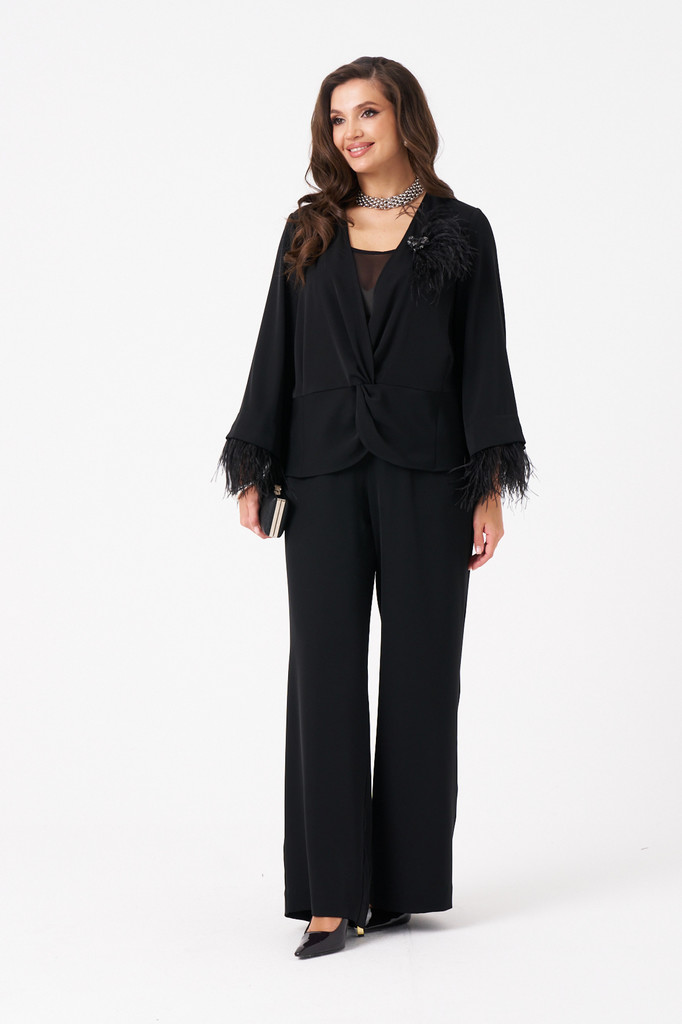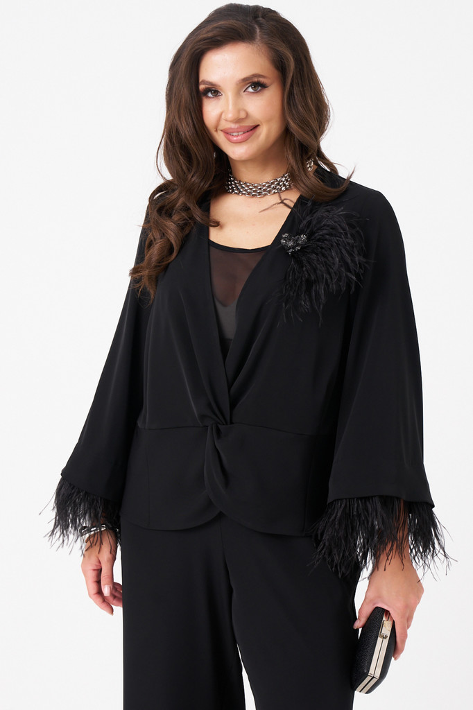 Описание Эта женская блузка выполнена из струящейся ткани, что обеспечивает комфорт и легкость при носке. Модель предназначена для повседневной носки и отличается полуприлегающим силуэтом, подчеркиваю... Показать описаниещим фигуру. Передняя часть украшена подрезом и перекрутом, создающими красивые складки и придающими изделию изящный вид. Рукава втачные длинные, расширяющиеся к низу, украшены декоративной тесьмой с перьями по краю. Перья крепятся на маленькие кнопки и при желании отстёгиваются дл ясоздания нового образа или для стирки блузки. Спинка изделия выполнена со средним швом, что обеспечивает комфортную посадку. Цвет блузки — классический черный, что делает ее универсальной для различных случаев и легко сочетаемой с другими вещами. Параметры Рост: 164 48 Блузка: Длина изделия - 65см, Длина рукава - 49см, Ширина плеча - 11.2см, Ширина по груди - 51см, Ширина по низу - 53.5см, Ширина рукава - 20.3см; 50 Блузка: Длина изделия - 65см, Длина рукава - 49см, Ширина плеча - 11.5см, Ширина по груди - 53см, Ширина по низу - 55.5см, Ширина рукава - 21см; 52 Блузка: Длина изделия - 65см, Длина рукава - 49см, Ширина плеча - 11.5см, Ширина по груди - 55см, Ширина по низу - 57.5см, Ширина рукава - 21.5см; 54 Блузка: Длина изделия - 65см, Длина рукава - 49см, Ширина плеча - 11.5см, Ширина по груди - 57см, Ширина по низу - 59.5см, Ширина рукава - 22.2см; 56 Блузка: Длина изделия - 66см, Длина рукава - 49см, Ширина плеча - 11.7см, Ширина по груди - 59см, Ширина по низу - 61.5см, Ширина рукава - 23см; 58 Блузка: Длина изделия - 66см, Длина рукава - 49см, Ширина плеча - 11.7см, Ширина по груди - 61см, Ширина по низу - 63.5см, Ширина рукава - 23.7см; Состав и уход Состав: Полиэстер 65%; вискоза 32%; эластан 3%. Уход: * Стирка при температуре воды до 30°C * Не отбеливать * Гладить при температуре утюга до 110°C * Вертикальная сушка * Барабанная сушка запрещена * Профессиональная сухая чистка в тетрахлорэтилене и во всех растворителях, внесенных в список для символа F.