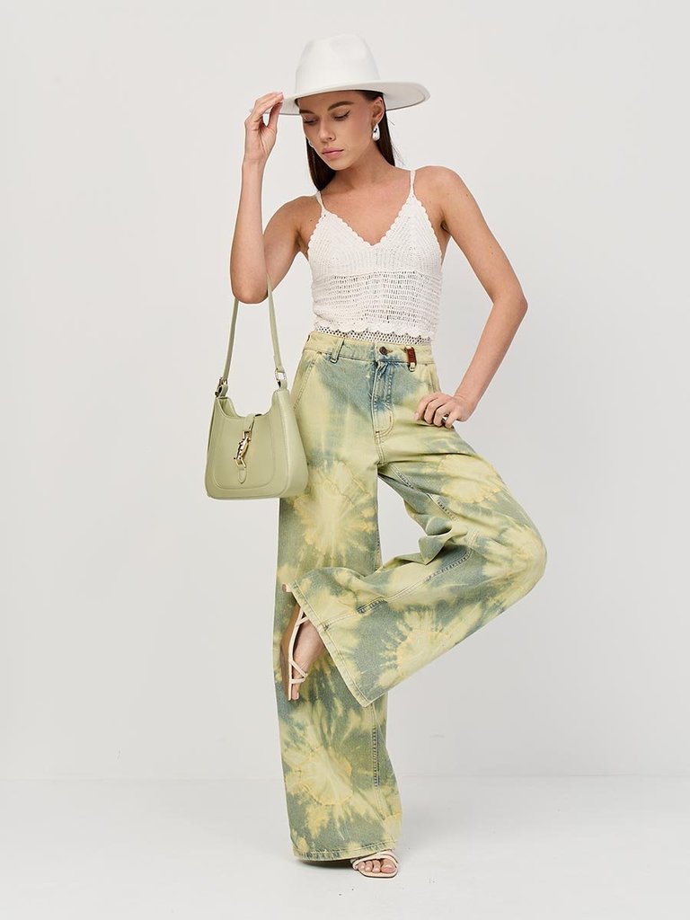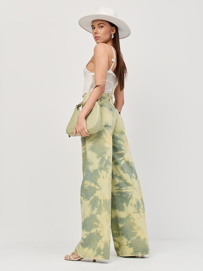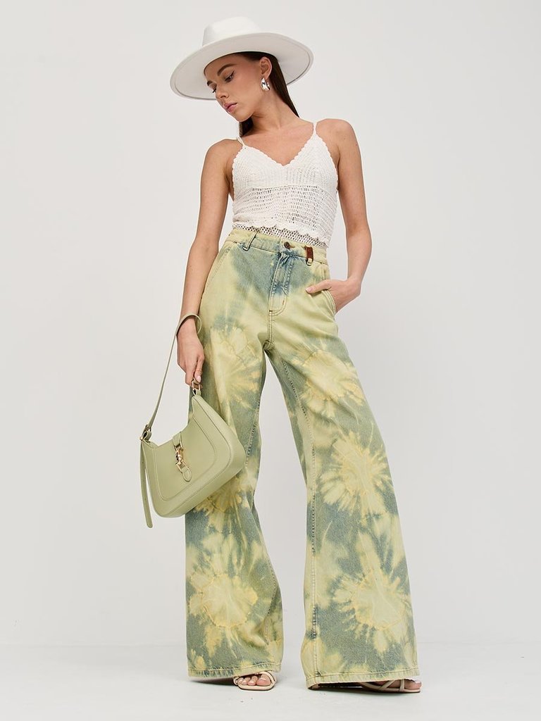 Цвет: стирка средняя Состав: 100%Хлопок Материал: Blue denim 009 Вес материала: 11 Фит: Palazzo Талия спереди: высокая Талия сзади: высокая Ширина колена: 32см Ширина низа: 34см ID: 153021 Описание Эт... Показать описаниеа модель маломерит, выбирайте размер по таблице, представленной в ряде фотографий. На девушке 27 размер. Её талия 62см, бёдра 90см, рост 172см Лимитированная серия джинсов ПАЛАЦЦО (PALAZZO), где каждая пара джинсов не похожа на другую. Это широкие джинсы с высокой посадкой идеально подходят для создания расслабленного, непринужденного образа. Также подходят как для повседневного ношения, так и для особых, но неформальных случаев. Изготовленные из мягкого традиционного денима, они обеспечивают полное сочетание удобства и практичности. Высокая талия с вытачками сзади для улучшения посадки пояса, карманы "хулиганы", свободные штанины сильно расширяющиеся к низу, позволяют получить утонченный силуэт и подчеркнуть особенности женской фигуры наилучшим образом и в тоже время обеспечить свободу движений. Эти джинсы с уникальным эффектом стирки по технологии "Тай-дай (Tie-dye)", т.е.способом стирки путем скручивания, складывания и заматывания изделия с целью получения уникальных хаотичных и размытых узоров и последующим эффектом подкрашивания "GET DIRTY", т.е. эффектом запачканных джинсов. Рекомендации по уходу * * * * * Стирать в стиральной машине при температуре 30° Не использовать отбеливатель Ручная стирка при температуре 30° Гладить при минимальной температуре Химчистка недопустима