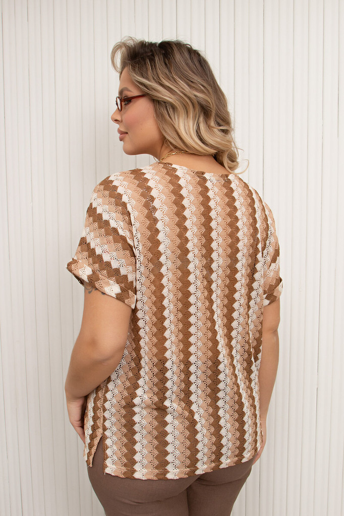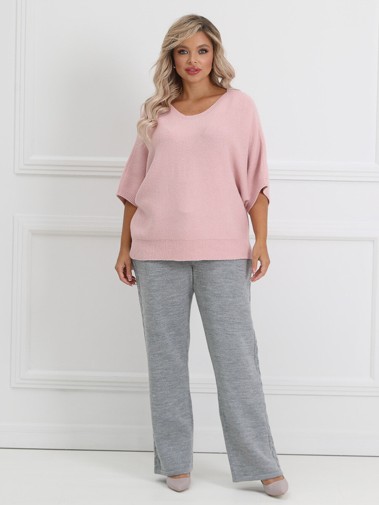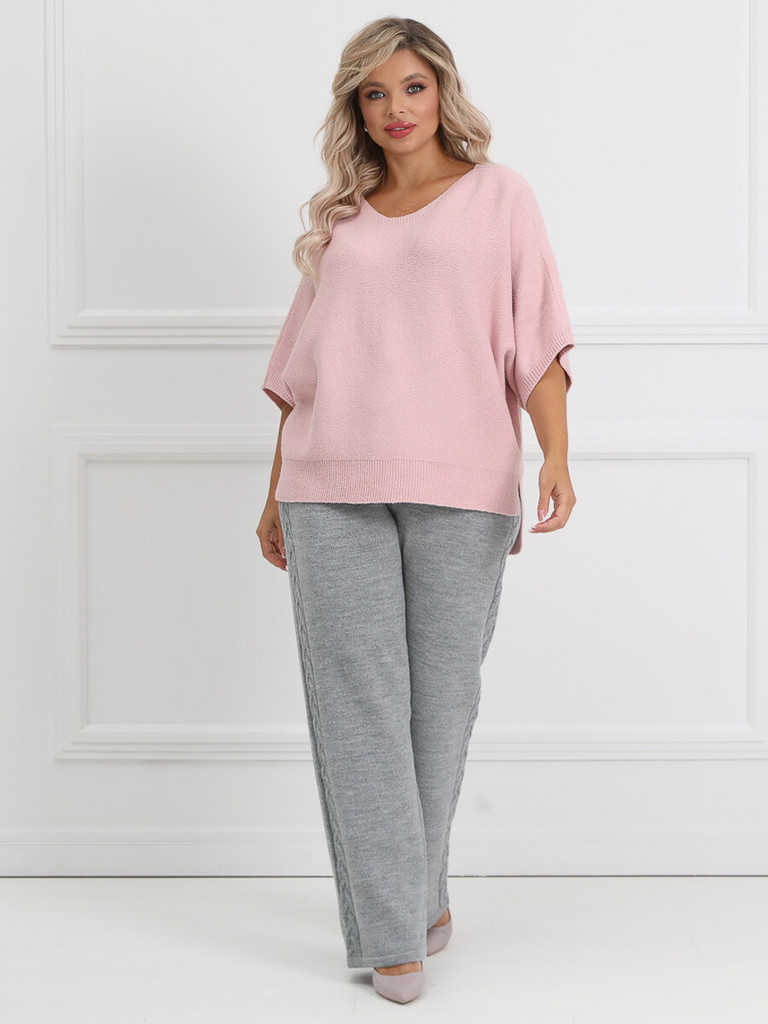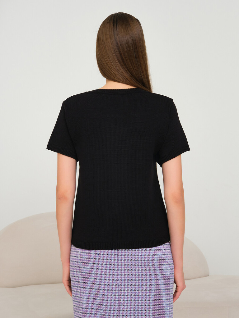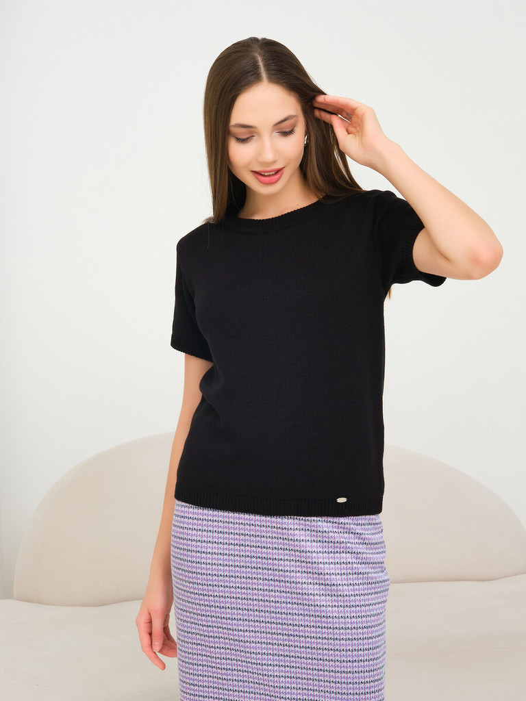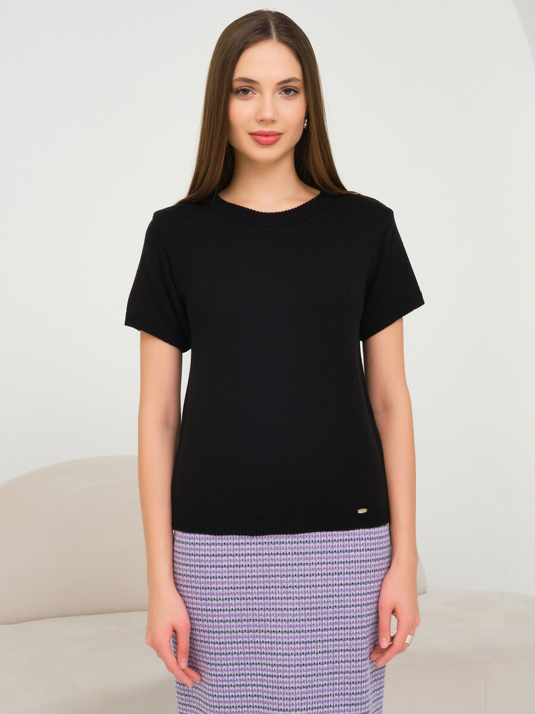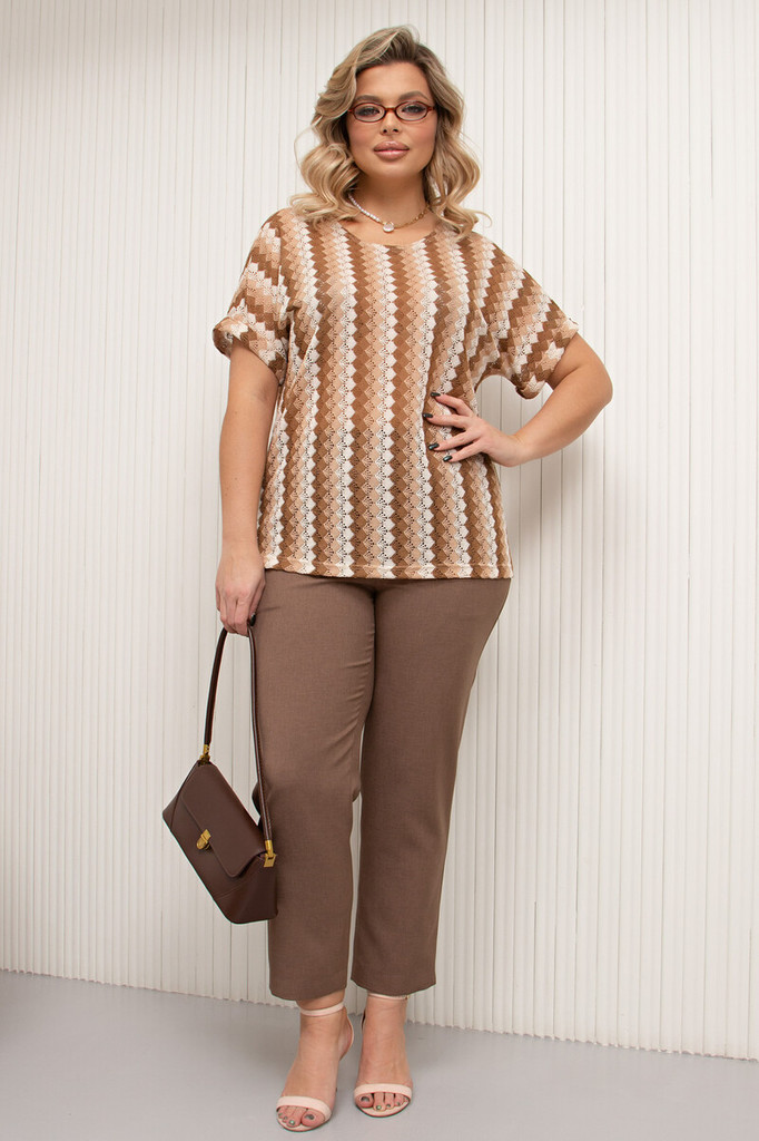 Красивая футболка прямого силуэта из трикотажного полотна. Короткие цельнокроеные рукава, оканчиваются манжетами на отворотах. Округлый вырез горловины. Низ ровный, по бокам разрезы. Блузка представле... Показать описаниена с брюками Морис № 16 Рекомендуемая стирка при t не более 30°. Длина изделия: 42, 44 р - 60 см; 46, 48, 50 р - 62 см; 52, 54, 56 р - 65 см Длина рукава от горловины: 31 см Рост фотомодели: 170 см Размер фотомодели: 52 Ткань: Трикотаж