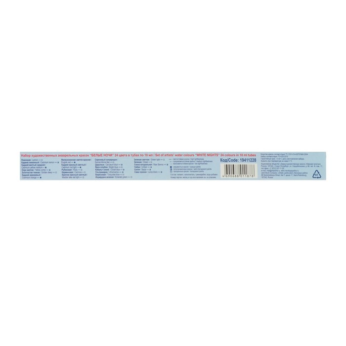 Профессиональные художественные акварельные краски "Белые ночи" представляют собой тонкодисперсные суспензии пигментов и наполнителей в связующем, в состав которого входит водный раствор растительного... Показать описание клея – гуммиарабика. Все акварельные краски в палитре "Белые ночи" безопасны, сертифицированы и соответствуют стандартам ASTM D-4236. Высокая концентрация пигмента обеспечивают максимальную интенсивность цветового тона акварели. Насыщенность сохраняется даже при разбавлении большим количеством воды. Отличаются прозрачностью, что дает возможность художнику работать тонкими лессировками. Чистые цвета позволяют писать в смесях и получать богатое многообразие оттенков. Основная часть красок обладает высочайшим показателем светостойкости, что способствует сохранности работ свыше 100 лет. Все это обеспечивает их высокое качество и возможность использования в ответственных работах. Краски в тубах обладают пастообразной консистенцией, не требуют дополнительного размачивания водой и сразу готовы к применению. Рекомендуются для живописи на больших форматах, для смешивания красочных растворов, для заливок больших участков бумаги, для заполнения пустых кювет. Сбалансированная палитра из 24 цветов в наборе "Белые ночи" позволяет решить множество творческих задач акварелиста. Набор представлен в пластиковом коррексе и картонном чехле.