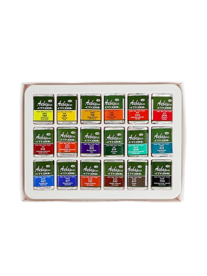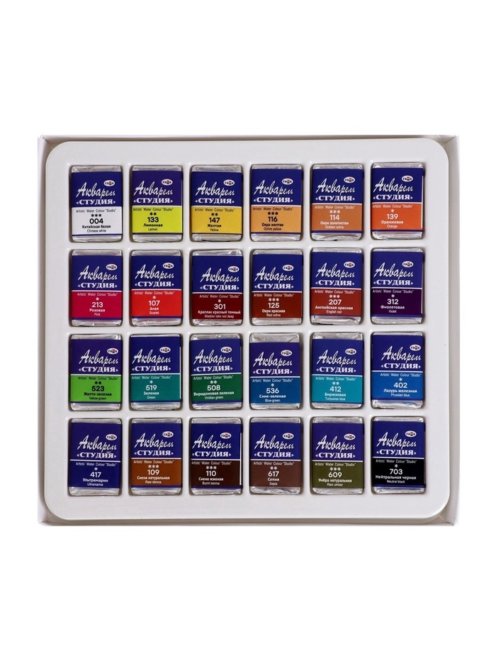 Сверхтонкие акварельные краски «Студия» на основе устойчивых пигментов. Яркие, насыщенные цвета, отличная светостойкость. Краски прекрасно смешиваются между собой, легко размываются. Дают прозрачный, ... Показать описаниене желтеющий слой, не препятствуют отражению света от бумаги. Акварельные краски серии «Студия» изготовлены на основе гуммиарабика. Полусухая акварель сушится при температуре не выше 40 °C , что позволяет сохранить яркость и свежесть краски. После высыхания она становится матовой. Цвета легко смешиваются между собой, прекрасно размываются и легко набираются из кюветы. Набор из 24 цветов акварельных красок идеально подойдёт для начинающих художников и студентов художественных училищ. Особенности * Без кисти * Объём кюветы – 2,6 мл (3,5 см?). 24 цвета * 004 китайская белая * 107 алая * 109 сиена натуральная * 110 сиена жженая * 114 охра золотистая * 116 охра желтая * 125 охра красная * 133 лимонная * 139 оранжевая * 147 желтая * 207 английская красная * 213 розовая * 301 краплак красный темный * 312 фиолетовая * 402 лазурь железная * 412 бирюзовая * 417 ультрамарин * 508 виридоновая зеленая * 519 зеленая * 523 желто-зеленая * 536 сине-зеленая * 609 умбра натуральная * 617 сепия * 703 нейтральная черная