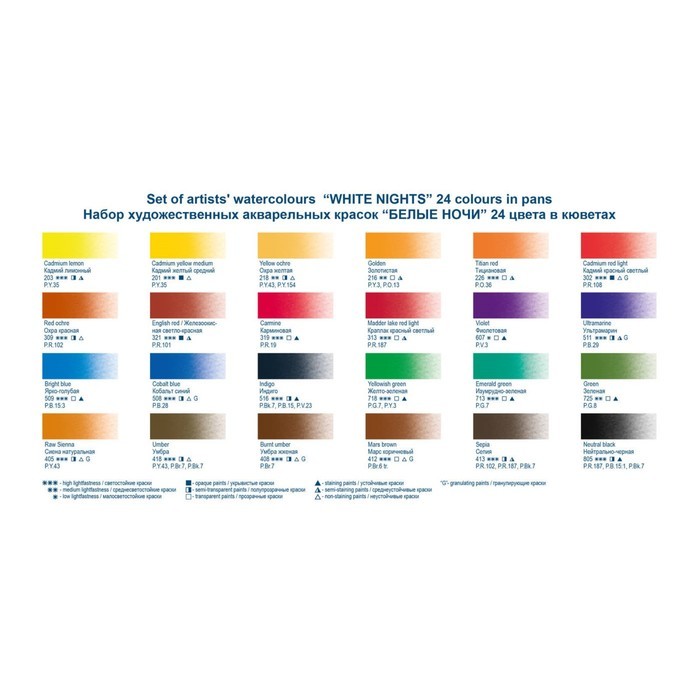 Профессиональные художественные акварельные краски "Белые ночи" представляют собой тонкодисперсные суспензии пигментов и наполнителей в связующем, в состав которого входит водный раствор растительного... Показать описание клея – гуммиарабика. Все акварельные краски в палитре "Белые ночи" безопасны, сертифицированы и соответствуют стандартам ASTM D-4236. Высокая концентрация пигмента обеспечивают максимальную интенсивность цветового тона акварели. Насыщенность сохраняется даже при разбавлении большим количеством воды. Отличаются прозрачностью, что дает возможность художнику работать тонкими лессировками. Чистые цвета позволяют писать в смесях и получать богатое многообразие оттенков. Основная часть красок обладает высочайшим показателем светостойкости, что способствует сохранности работ свыше 100 лет. Все это обеспечивает их высокое качество и возможность использования в ответственных работах. Сбалансированная палитра набора "Белые ночи" состоит из 24 цветов, позволяющих решить множество творческих задач акварелиста. Набор представлен в пластиковом коррексе и картонном чехле.