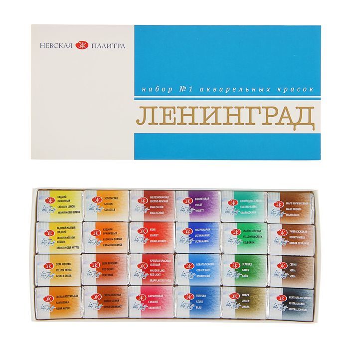 Традиционный набор "Ленинград" в ретро-дизайне знаком нескольким поколениям художников. Сбалансированная палитра состоит из 24 цветов акварели "Белые ночи", позволяющих решить множество творческих зад... Показать описаниеач. Набор представлен в классической картонной коробке. Профессиональные художественные акварельные краски "Белые ночи" представляют собой тонкодисперсные суспензии пигментов и наполнителей в связующем, в состав которого входит водный раствор растительного клея – гуммиарабика. Все акварельные краски в палитре "Белые ночи" безопасны, сертифицированы и соответствуют стандартам ASTM D-4236. Высокая концентрация пигмента обеспечивают максимальную интенсивность цветового тона акварели. Насыщенность сохраняется даже при разбавлении большим количеством воды. Отличаются прозрачностью, что дает возможность художнику работать тонкими лессировками. Чистые цвета позволяют писать в смесях и получать богатое многообразие оттенков. Основная часть красок обладает высочайшим показателем светостойкости, что способствует сохранности работ свыше 100 лет. Все это обеспечивает их высокое качество и возможность использования в ответственных работах.