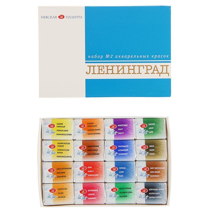 Традиционный набор "Ленинград" в ретро-дизайне знаком нескольким поколениям художников. Сбалансированная палитра состоит из 16 основных цветов акварели "Белые ночи", необходимых для работы. Набор пред... Показать описаниеставлен в классической картонной коробке. Профессиональные художественные акварельные краски "Белые ночи" - тонкодисперсные суспензии пигментов и наполнителей в связующем, в состав которого входит водный раствор растительного клея – гуммиарабика. Все акварельные краски в палитре "Белые ночи" безопасны, сертифицированы и соответствуют стандартам ASTM D-4236. Высокая концентрация пигмента обеспечивают максимальную интенсивность цветового тона акварели. Насыщенность сохраняется даже при разбавлении большим количеством воды. Отличаются прозрачностью, что дает возможность художнику работать тонкими лессировками. Чистые цвета позволяют писать в смесях и получать богатое многообразие оттенков. Основная часть красок обладает высочайшим показателем светостойкости, что способствует сохранности работ свыше 100 лет. Все это обеспечивает их высокое качество и возможность использования в ответственных работах.
