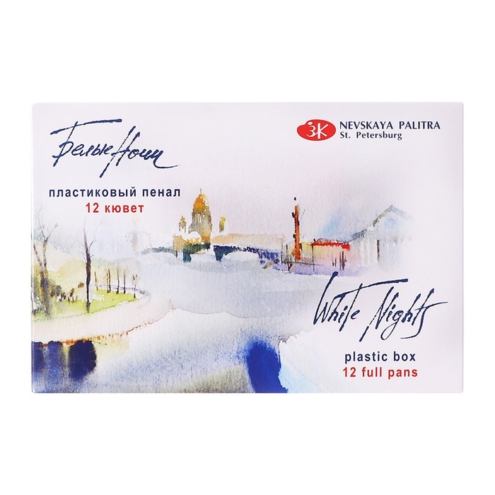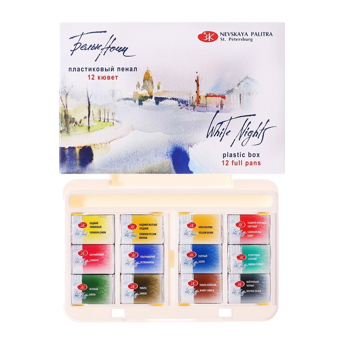 Профессиональные художественные акварельные краски "Белые ночи" представляют собой тонкодисперсные суспензии пигментов и наполнителей в связующем, в состав которого входит водный раствор растительного... Показать описание клея – гуммиарабика. Все акварельные краски в палитре "Белые ночи" безопасны, сертифицированы и соответствуют стандартам ASTM D-4236. Высокая концентрация пигмента обеспечивают максимальную интенсивность цветового тона акварели. Насыщенность сохраняется даже при разбавлении большим количеством воды. Отличаются прозрачностью, что дает возможность художнику работать тонкими лессировками. Чистые цвета позволяют писать в смесях и получать богатое многообразие оттенков. Основная часть красок обладает высочайшим показателем светостойкости, что способствует сохранности работ свыше 100 лет. Все это обеспечивает их высокое качество и возможность использования в ответственных работах. Сбалансированная палитра набора акварельных красок "Белые ночи" в пластиковом пенале состоит из 12 основных цветов, необходимых художнику в студии и на пленэре.