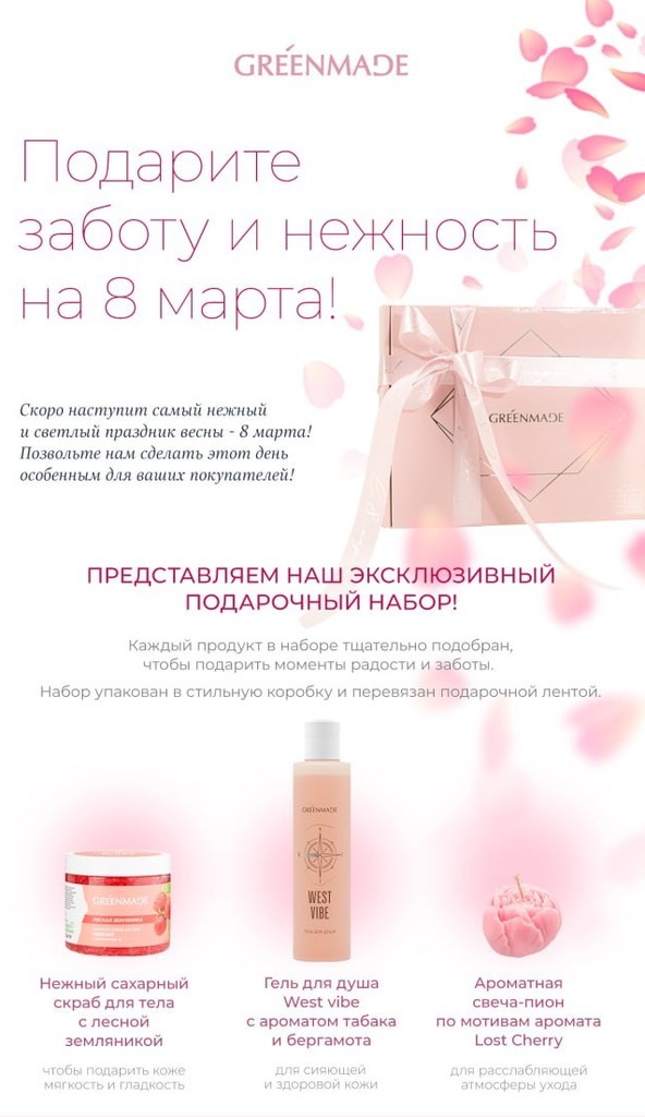 *Подарочный набор "Весна" (Состав: Гель для душа West vibe Восток 200 мл, скраб для тела Лесная Земляника 250 мл, свеча с ароматом, коробка подарочная розовая, лента упаковочная)Вопросы по товару