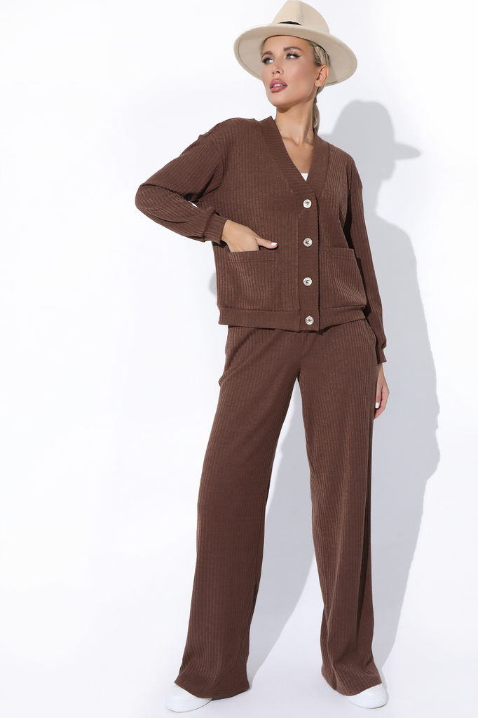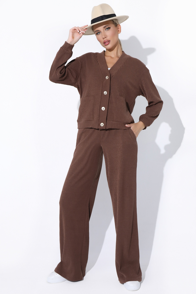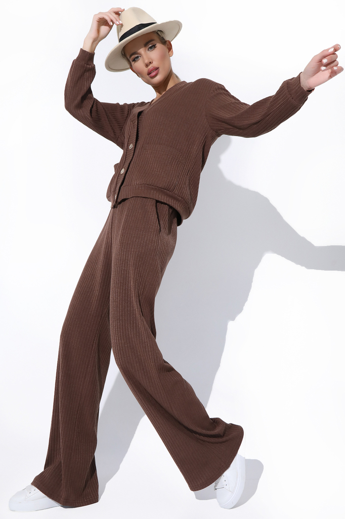 Состав: 55% – вискоза, 45%-п/э, 5%-эластан Описание Модный брючный костюм из трикотажа “лапша” прекрасно подойдет на осенний и зимний сезон. Состоит из модного бомбера с широкими штанами. талия у брюк... Показать описание на резинке, карманы. Бомбер с планкой на пуговицах, накладные карманы. Материал: трикотаж Принт: отсутствует Вид застежки: пуговицы Карманы: есть Резинка в поясе: есть Силуэт: свободный Длина верха: 46-48р -57 см, 50-52р – 59 см Длина брюк: 46-48р – 105, 50-52р – 107 см Размер изделия на модели: 46 Рост модели: 172 см
