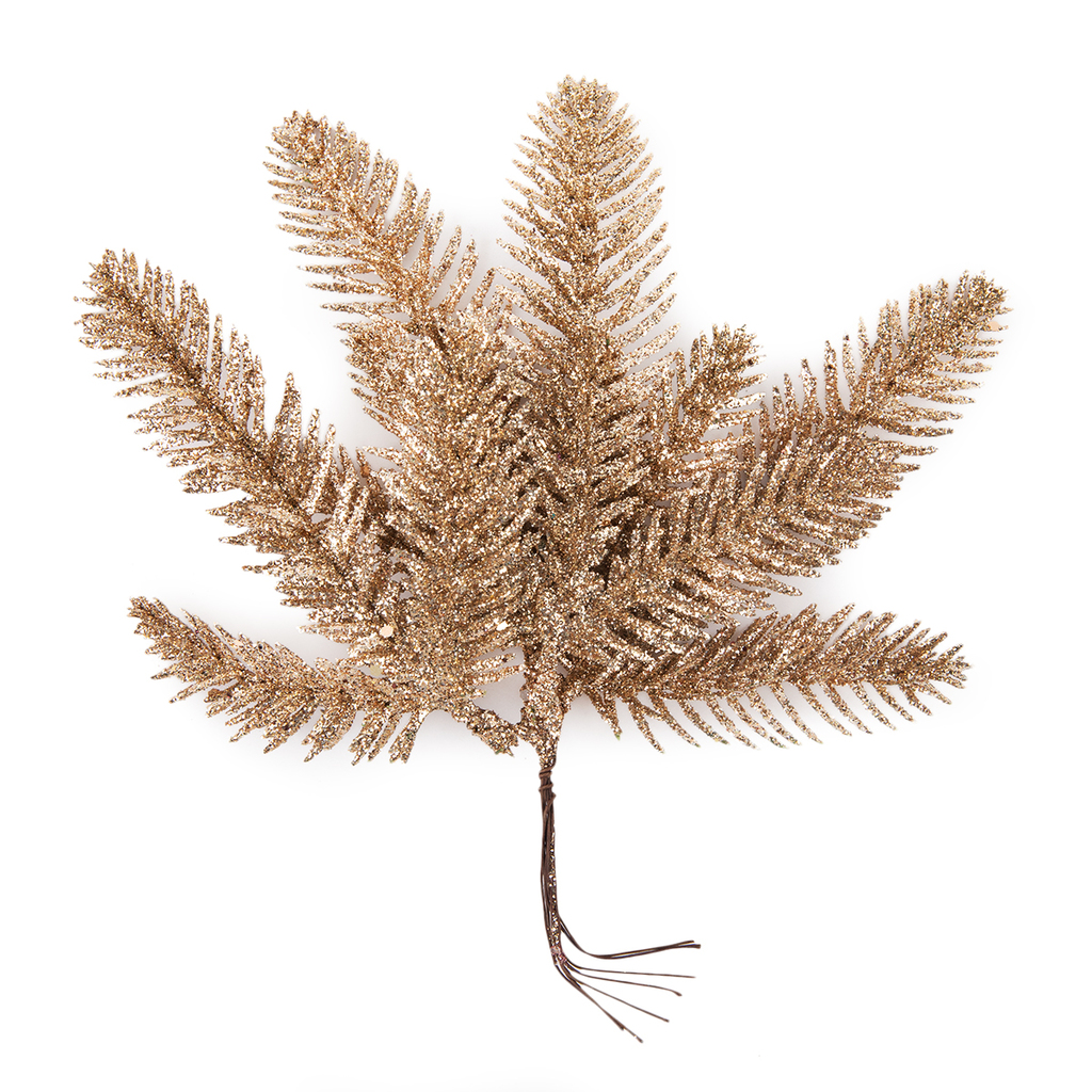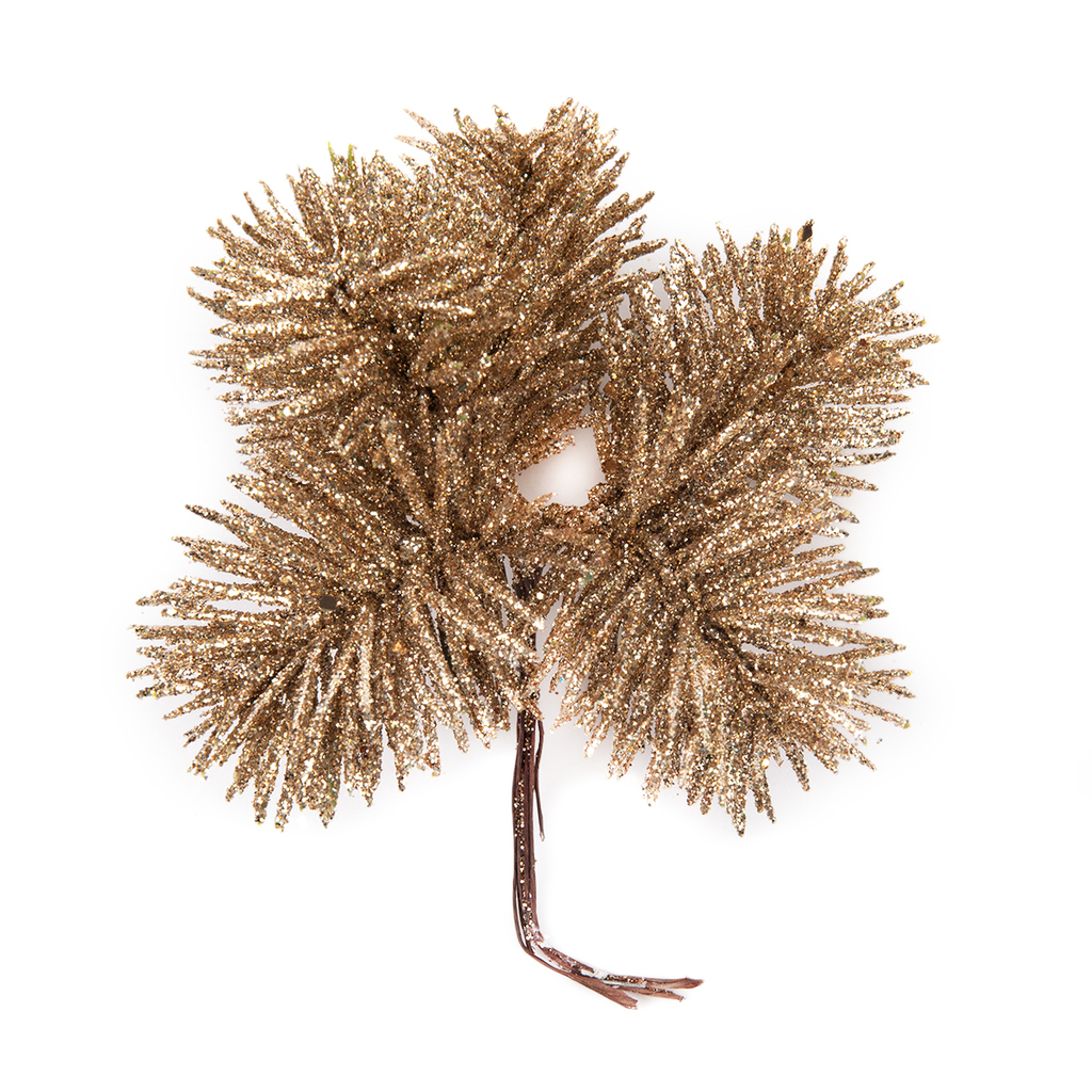 Декоративная веточка "Blumentag" VDD-138 используются во флористике, в композициях из искусственных цветов, в изготовлении новогодних венков, в топиариях, в декоре интерьера, оформлении подарков. Она ... Показать описаниепрекрасно подойдет для создания осенней или зимней поделки. Основание из гибкой проволоки искусственной веточки обернуто флористической лентой, искусственная хвоя покрыта золотистым оттенком глиттера. Осыпание глитера не является браком. Длина 24 ± 1 см В упаковке 6 шт.
