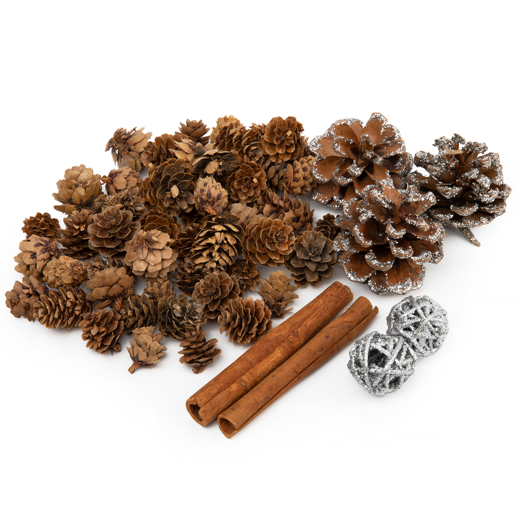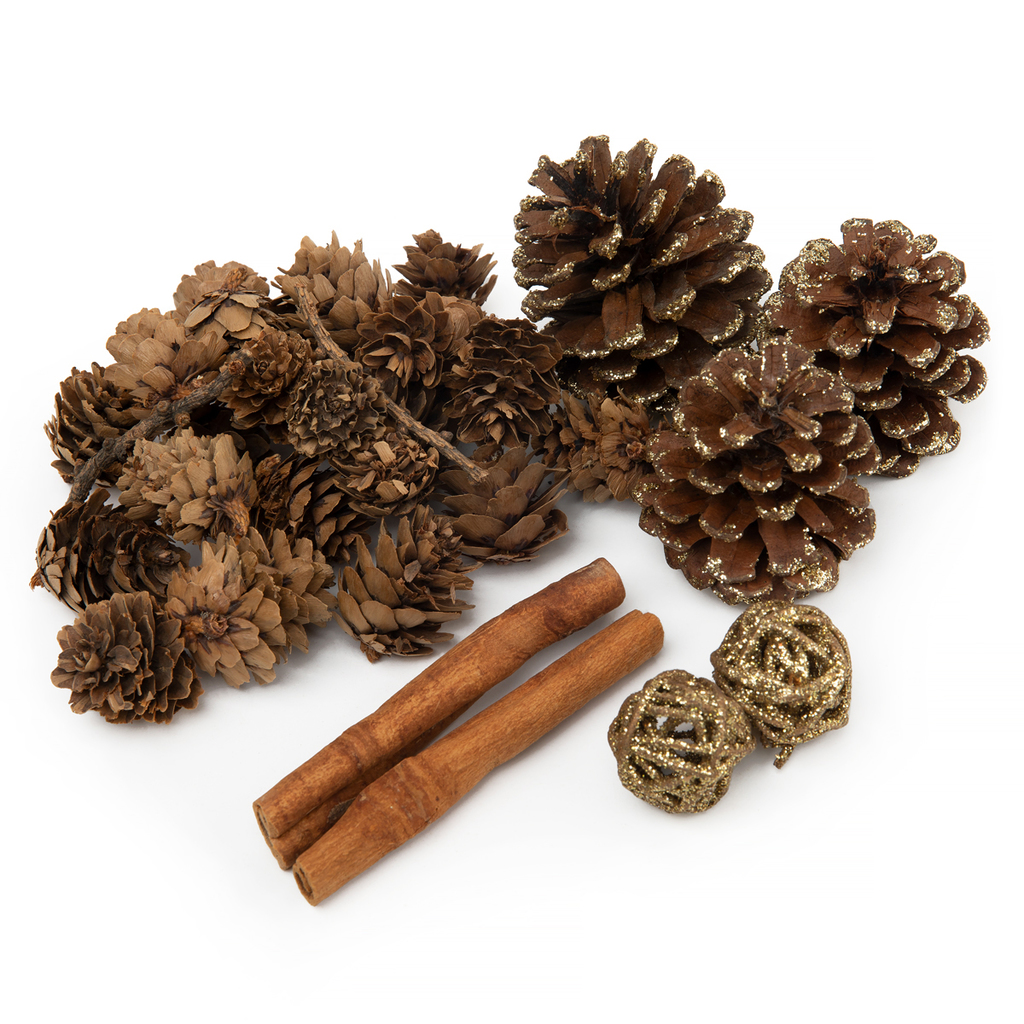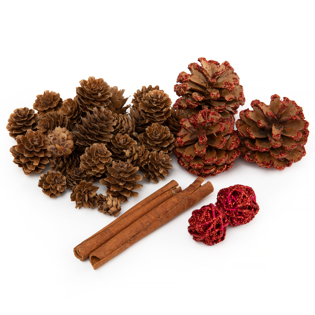С набором природных материалов "Blumentag" DRS-01 можно создавать уникальные композиции, сочетая разные текстуры и цвета. Набор природных материалов "Blumentag" DRS-01 используется для создания флорис... Показать описаниетических интерьерных композиций, цветочной композиции, возможно использовать как основу при изготовлении топиариев, послужит отличным декором при оформлении подарочных корзин с фруктами, чайных и кофейных наборов. Так же применяется при оформлении подарков. Сочетание материалов набора позволяет создавать оригинальные композиции, которые будут выглядеть стильно и гармонично в любом интерьере. Кроме того, использование натуральных материалов делает такие композиции экологически чистыми и безопасными для здоровья. В набор входят: Шишки с глиттером: диаметр от 5.5 до 5.9 ± 1 см, высота от 5.7 до 6.1 ± 1 см - 3 шт. Шишки: диаметр от 1.5 до 2.9 ± 0.5 см, высота от 2.1 до 3.1 ± 0.5 см, вес 35 ± 5 г. Палочки корицы: диаметр от 1.4 до 1.7 ± 0.5 см, длина от 9.2 до 10 ± 1 см. - 2 шт. Шарики из ротанга: диаметр от 2.8 до 3.2 ± 0.5 см - 2 шт. Вес набора: 100 ± 10 г