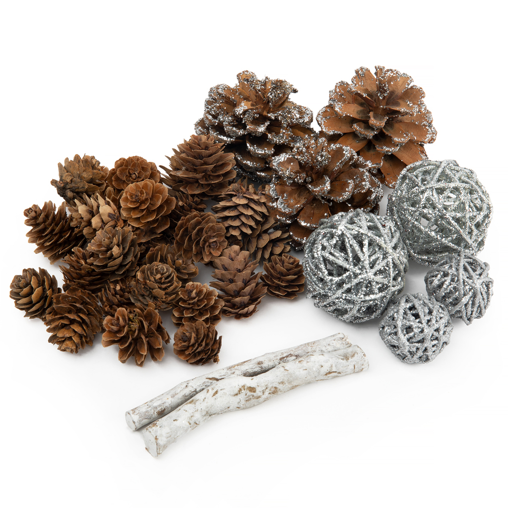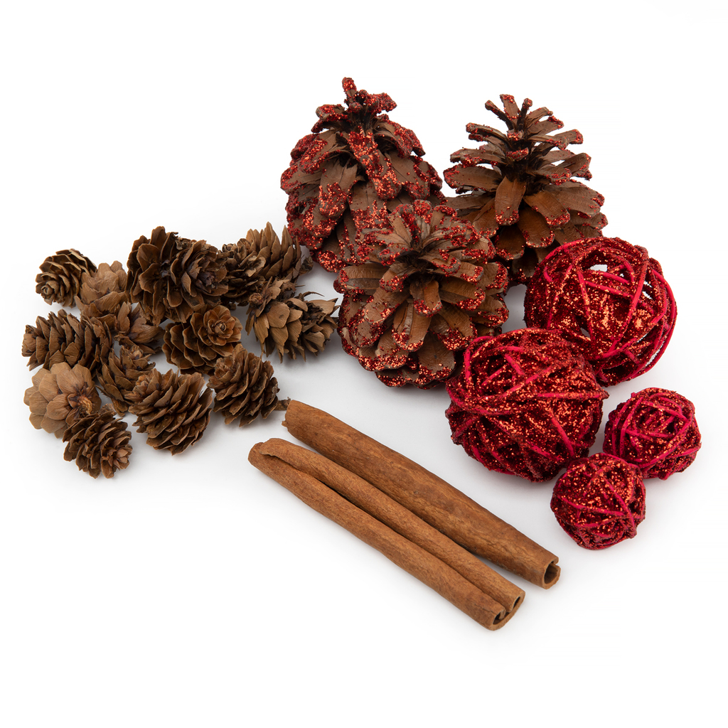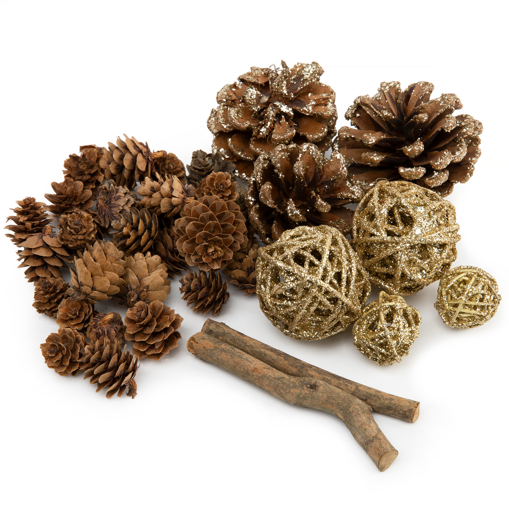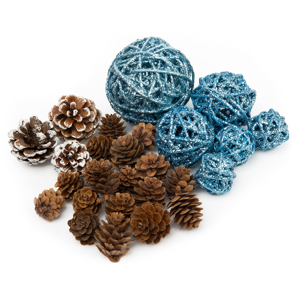 С набором природных материалов "Blumentag" DRS-01 можно создавать уникальные композиции, сочетая разные текстуры и цвета. Набор природных материалов "Blumentag" DRS-01 используется для создания флорис... Показать описаниетических интерьерных композиций, цветочной композиции, возможно использовать как основу при изготовлении топиариев, послужит отличным декором при оформлении подарочных корзин с фруктами, чайных и кофейных наборов. Так же применяется при оформлении подарков. Сочетание материалов набора позволяет создавать оригинальные композиции, которые будут выглядеть стильно и гармонично в любом интерьере. Кроме того, использование натуральных материалов делает такие композиции экологически чистыми и безопасными для здоровья. В набор входят: Шишки с глиттером: диаметр от 5.5 до 5.9 ± 1 см, высота от 5.7 до 6.1 ± 1 см - 3 шт. Шишки: диаметр от 1.5 до 2.9 ± 0.5 см, высота от 2.1 до 3.1 ± 0.5 см, вес 35 ± 5 г. Палочки корицы: диаметр от 1.4 до 1.7 ± 0.5 см, длина от 9.2 до 10 ± 1 см. - 2 шт. Шарики из ротанга: диаметр от 2.8 до 3.2 ± 0.5 см - 2 шт. Вес набора: 100 ± 10 г