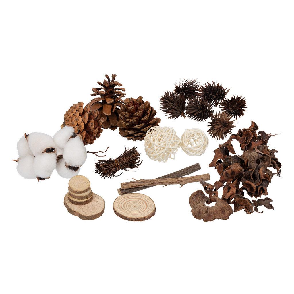 Набор природных материалов "Blumentag" SNJ-03 сочетает в себе различные текстуры, цвета и формы материалов, благодаря чему можно создавать декоративные композиции на любой вкус. Набор с палочками кори... Показать описаниецы, хлопоковыми коробочками, шишками, спилами, ротанговыми шарами, древесными палочками и сухоцветами используется для создания флористических интерьерных композиций, цветочных композиций, можно использовать как основу при изготовлении топиариев и венков, послужит отличным декором при оформлении подарочных корзин с фруктами, чайных и кофейных наборов, так же применяется при оформлении подарков. Использование натуральных материалов "Blumentag" SNJ-03 в флористике и декоре не только придает уникальность каждой работе, но также способствует созданию экологически чистого и гармоничного пространства. В набор входят: Хлопковая коробочка: диаметр 7.2 ± 1 см, высота 4.4 ± 0.5 см - 1 шт. Шишки: диаметр 4.9 ± 0.5 см, высота 4.5 ± 0.5 см - 2 шт. Спилы дерева: диаметр от 2.4 до 2.7 ± 0.5 см, высота 0.5 см ± 0.1 см - 3 шт. диаметр от 4.4 до 4.6 ± 0.5 см, высота 0.5 см ± 0.1 см - 2 шт. диаметр 6.4 ± 0.5 см, высота 1 ± 0.2 см - 1 шт. Деревянные палочки: диаметр 0.9 ± 0.2 см, длина 11 ± 1 см. Ротанговый шар: диаметр 3 и 4.3 ± 0.5 см -2 шт. Сушеная трава в пучках: диаметр пучка 1.5 ± 0.5 см, длина 4.3 ± 0.5 см -1 шт. Сушеные цветы: длина от 3.1 до 3.9 ± 0.5 см, ширина от 2.5 до 3.1 ± 0.5 см - 6 шт. Сушеные листья: 17 ± 5 г. Упаковка: 100 г ± 5 г.