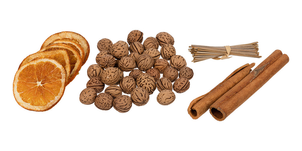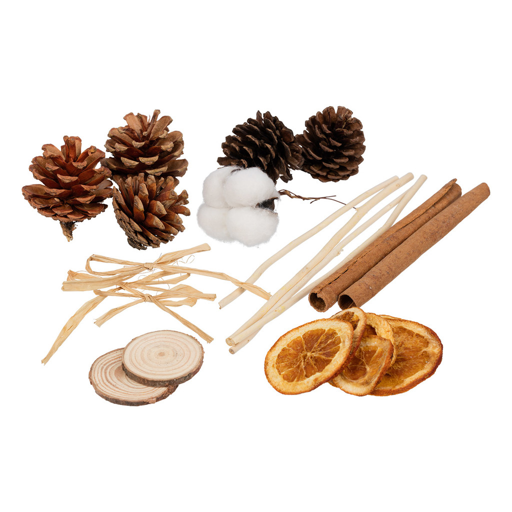 Набор природных материалов "Blumentag" SNJ-02 сочетает в себе различные текстуры, цвета и формы материалов, благодаря чему можно создавать декоративные композиции на любой вкус. Набор с палочками кори... Показать описаниецы, сушеным апельсином, шишками, коробочкой хлопка и стеблями растений используется для создания флористических интерьерных композиций, цветочных композиций, можно использовать как основу при изготовлении топиариев и венков, послужит отличным декором при оформлении подарочных корзин с фруктами, чайных и кофейных наборов, так же применяется при оформлении подарков. Использование натуральных материалов "Blumentag" SNJ-02 в флористике и декоре не только придает уникальность каждой работе, но также способствует созданию экологически чистого и гармоничного пространства. В набор входят: Сушеный апельсин: диаметр от 4.7 до 5.5 ± 0.5 см - 5 шт. Палочки корицы: диаметр от 1.5 до 1.9 ± 0.5 см, длина от 9.7 до 10.1 ± 1 см - 2 шт. Хлопковая коробочка: диаметр 7.2 ± 1 см, высота 4.4 ± 0.5 см - 1 шт. Шишки: диаметр от 4.9 до 5.2 ± 0.5 см, высота от 4.5 до 4.9 ± 0.5 см - 3 шт. Спилы дерева: диаметр от 5.8 до 6.2 ± 0.5 см, высота 0.9 ± 0.3 см - 2 шт. Сушеная солома: диаметр от 0.4 до 0.5 ± 0.2 см, длина от 20 до 20.4 см ± 1 см - 4шт. Сушеные стебли: длина от 9.6 до 11.5 ± 1 см - 3 шт.