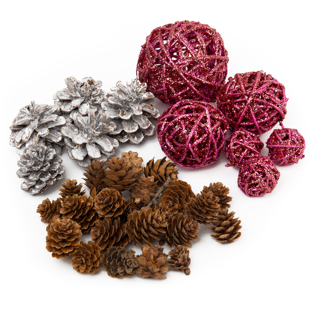 С набором природных материалов "Blumentag" DRS-02 можно создавать уникальные композиции, сочетая разные текстуры и цвета. Набор природных материалов "Blumentag" DRS-02 используется для создания флорис... Показать описаниетических интерьерных композиций, цветочной композиции, возможно использовать как основу при изготовлении топиариев, послужит отличным декором при оформлении подарочных корзин с фруктами, чайных и кофейных наборов. Так же применяется при оформлении подарков. Сочетание материалов набора позволяет создавать оригинальные композиции, которые будут выглядеть стильно и гармонично в любом интерьере. Кроме того, использование натуральных материалов делает такие композиции экологически чистыми и безопасными для здоровья. Цвет 1 - состав: Шары из ротанга: диаметр: от 2.8 до 3.2 ± 0.5 см - 2 шт. диаметр от 4.4 до 5.8 ± 0.5 см - 2 шт. Шишки с глиттером: диаметр от 5.7 до 7.3 ± 1 см, высота от 5.2 до 5.8 ± 1 см - 3 шт. Шишки: диаметр от 1.3 до 3.4 ± 0.5 см, высота от 1.9 до 3.7 ± 0.5 см, вес 32 ± 10 г. Палочки из дерева: диаметр от 0.9 до 1.6 ± 0.5 см, длина от 10.3 до 10.5 ± 1 см - 2 шт. Вес набора: 80 ± 10 г. Цвет 2 - состав: Шары из ротанга: диаметр: от 3 до 3.2 ± 0.5 см - 2 шт. диаметр от 4.8 до 5.1 ± 0.5 см - 2 шт. Шишки с глиттером: диаметр от 5.2 до 6 ± 0.5 см, высота от 4.6 до 5.7 ± 0.5 см - 3 шт. Шишки: диаметр от 1.9 до 3.2 ± 0.5 см, высота от 2.1 до 3.4 ± 0.5 см, вес 31 ± 10 г. Палочки из дерева: диаметр от 0.9 до 1.6 ± 0.5 см, длина от 10 до 10.3 ± 1 см - 2 шт. Вес набора: 80 ± 10 г. Цвет 3 - состав: Шары из ротанга: диаметр: от 2.7 до 3.2 ± 0.5 см - 2 шт. диаметр от 4.6 до 5.1 ± 0.5 см - 2 шт. Шишки с глиттером: диаметр от 5.2 до 5.9 ± 0.5 см, высота от 6.3 до 6.7 ± 0.5 см - 3 шт. Шишки: диаметр от 1.8 до 3.1 ± 0.5 см, высота от 2.1 до 3.8 ± 0.5 см, вес 18 ± 10 г. Палочки корицы: диаметр от 1.1 до 1.7 ± 0.5 см, длина от 9.9 до 10.6 ± 1 см - 2 шт. Вес набора: 80 ± 10 г. Цвет 4 - состав: Шары из ротанга: диаметр: 6.9 ± 1 см - 1 шт. диаметр: от 4.5 до 5.4 ± 0.5 см - 2 шт. диаметр от 3 до 3.3 ± 0.5 см - 3 шт. Шишки покрашенные: диаметр от 3.8 до 4.6 ± 0.5 см, высота от 4.2 до 4.9 ± 0.5 см - 4 шт. Шишки: диаметр от 1.4 до 2.8 ± 0.5 см, высота от 1.6 до 4 ± 0.5 см, вес 18 ± 10 г. Вес набора: 80 ± 10 г. Цвет 5 - состав: Шары из ротанга: диаметр: 7 ± 1 см - 1 шт. диаметр: от 4.7 до 5 ± 0.5 см - 2 шт. диаметр от 2.8 до 3 ± 0.5 см - 3 шт. Шишки покрашенные: диаметр от 3.5 до 4.9 ± 0.5 см, высота от 3.7 до 4.6 ± 0.5 см - 5 шт. Шишки: диаметр от 1.6 до 2.7 ± 0.5 см, высота от 1.9 до 3.2 ± 0.5 см, вес 24 ± 10 г. Вес набора: 80 ± 10 г.