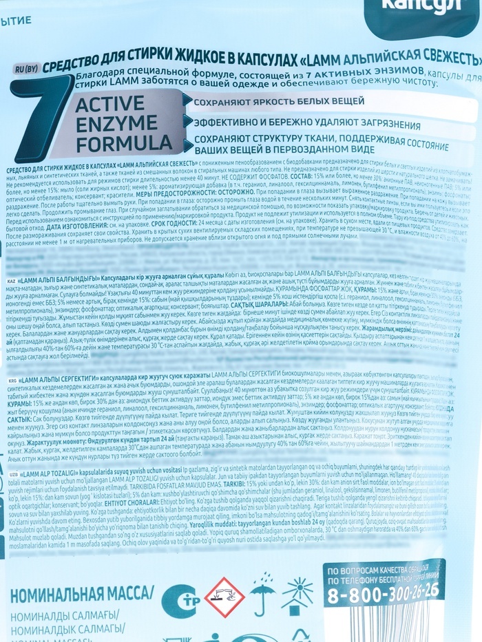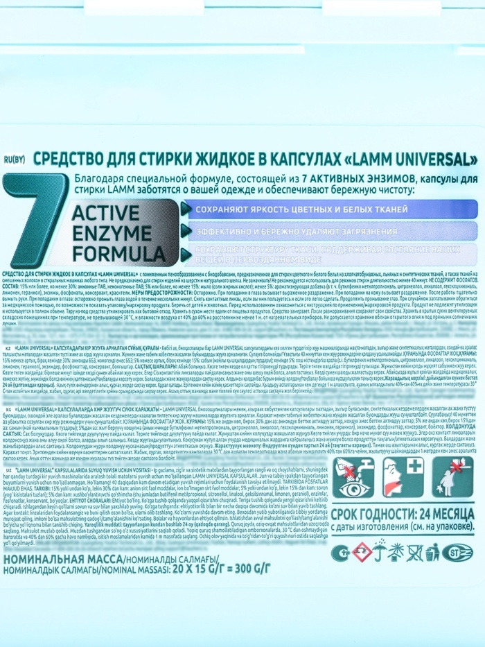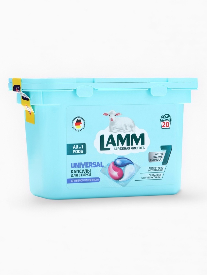 Мир безупречной чистоты и заботы о белье с капсулами для стирки LAMM Universal, 12 шт — универсальным решением для эффективного и удобного ухода за всеми типами тканей. Каждая капсула сочетает в себе ... Показать описаниемощное очищение и деликатный уход, позволяя белью оставаться мягким, свежим и ухоженным после каждой стирки. Основное действие * Эффективно удаляет загрязнения — капсулы содержат высококонцентрированную формулу для удаления пятен, грязи и неприятных запахов. * Сохраняет цвет и структуру ткани — активные компоненты бережно ухаживают за волокнами, предотвращая выцветание и износ. * Освежает бельё — придаёт мягкий, стойкий аромат, создавая ощущение чистоты и ухоженности. * Упрощает уход за тканями — сокращает необходимость предварительной обработки или замачивания. * Подходит для автоматических и ручных стирок, а также для всех типов тканей, включая хлопок, лен, синтетику и деликатные материалы. Преимущества * Удобная упаковка — 12 капсул, каждая из которых рассчитана на одну стирку стандартной загрузки. * Концентрированная формула обеспечивает экономичный расход средства и эффективную работу даже при низких температурах воды. * Гипоаллергенная формула, безопасная для детей и людей с чувствительной кожей. * Не требует дополнительного использования порошка, геля или пятновыводителя. * Капсулы упакованы так, чтобы обеспечивать удобство хранения и точное дозирование. Аромат Аромат капсул LAMM Universal — лёгкий и свежий, с ненавязчивыми цветочными нотами, которые наполняют бельё ощущением чистоты и свежести. Он раскрывается постепенно, оставляя мягкий и приятный шлейф после стирки. Способ применения Для машинной стирки: 1. Поместите 1 капсулу прямо в барабан стиральной машины, поверх белья. 2. Выберите подходящую программу стирки в зависимости от типа ткани и степени загрязнения. 3. Не требуется добавление других моющих средств. Для ручной стирки: 1. Растворите содержимое 1 капсулы в 5–10 литрах воды до полного растворения. 2. Опустите бельё в раствор и стирайте обычным способом. 3. Прополощите и высушите как обычно. Не разрезайте капсулу перед использованием. Беречь от детей и животных. Условия хранения Хранить при температуре от +5 °C до +25 °C, вдали от прямых солнечных лучей и нагревательных приборов. Не замораживать. Беречь от детей. Капсулы для стирки LAMM Universal, 12 шт — это сочетание удобства, универсальности и надёжной чистоты. Они позволяют легко ухаживать за любыми тканями, придавая белью мягкость, свежесть и ощущение заботы после каждой стирки.