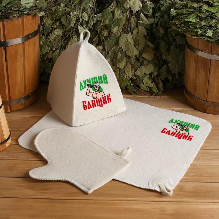 Набор для бани с принтом «Самому лучшему банщику», 3 предмета: шапка, коврик, рукавица, шерсть 30%, полиэфир 70%, светлый, «Банная забава»Вопросы по товару