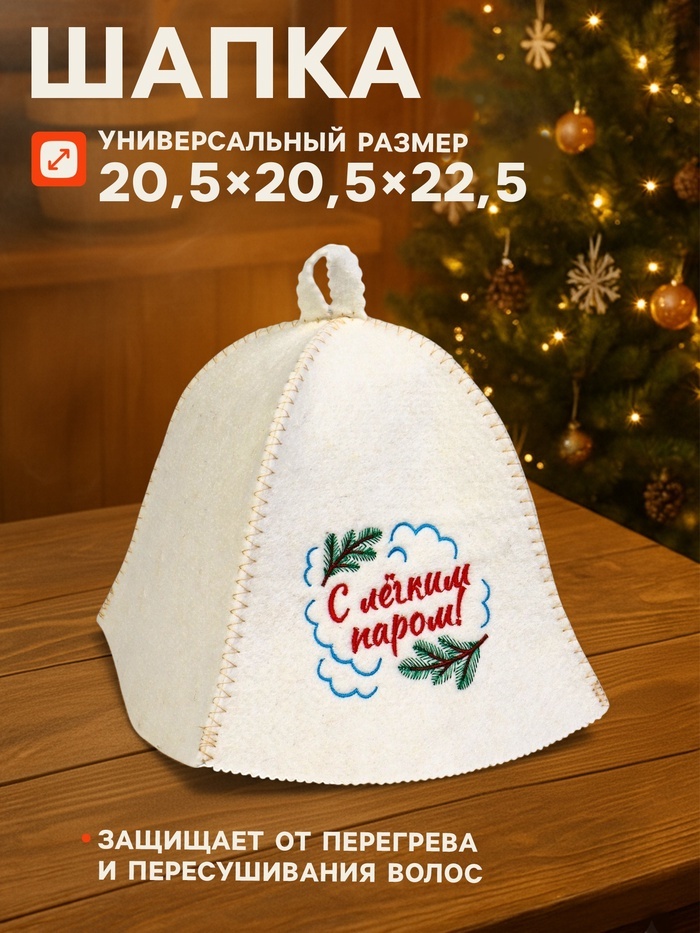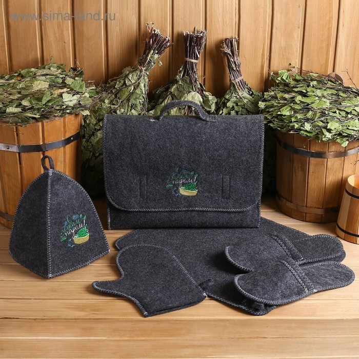 В набор входит: * портфель c вышивкой «С лёгким паром»; * банная шапка с вышивкой «С лёгким паром»; * рукавица; * тапочки; * коврик. В портфеле можно хранить банные принадлежности и средства личной ги... Показать описаниегиены. Банная шапка защитит голову от перегрева, волосы от ломкости, а рукавица — от случайных ожогов. Тапочки из войлока и коврик впитывают влагу и сохраняют сухость, что обеспечивает комфорт во время посещения парной.