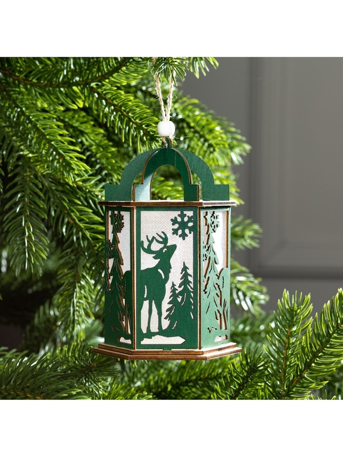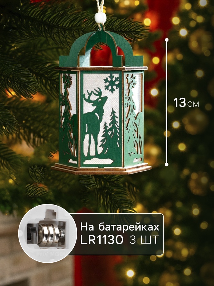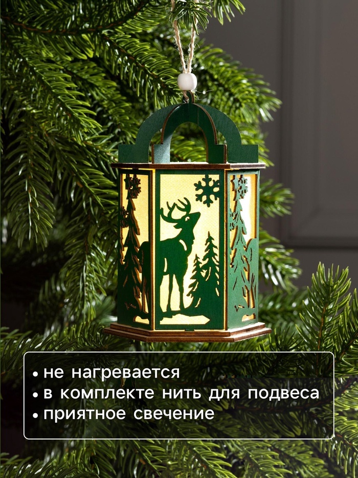 Ёлочная игрушка «Зелёный фонарь с оленем», 13?9?9 см, от батареек, свечение тёплое белоеВопросы по товару