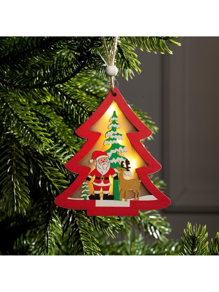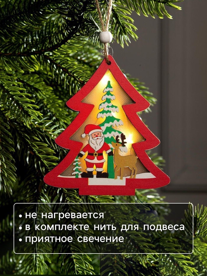 Ёлочная игрушка «Красная ёлочка с Дедом Морозом», 10?10?1 см, 3 LED, от батареек, свечение тёплое белоеВопросы по товару