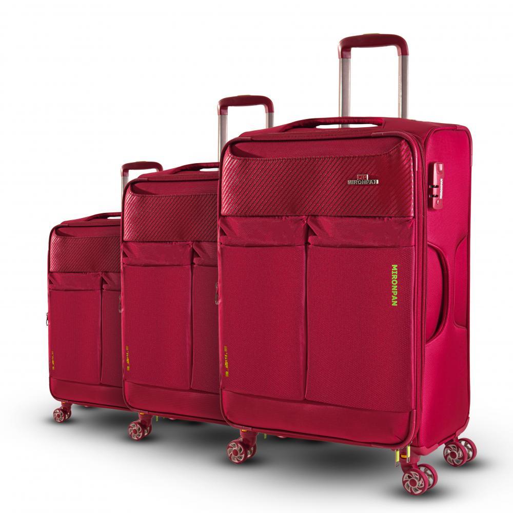 Комплект из 3-х чемоданов  MIRONPAN универсальная модель с возможностью увеличения объема. Модель в бордовом цвете обладает облегченным весом и выполнен из высокотехнологичного полиэстера - современно... Показать описаниего прочного материала, для которого характерны отличная износостойкость и влагостойкость. Основное отделение закрывается на молнию с 2 бегунками. Внутри 2 отделения: одно - с  ремнями-фиксаторами, другое - с тканевой перегородкой на молнии и вместительным карманом-сеткой на молнии. На лицевой стороне предусмотрено дополнительное отделение и  карман закрываются на  молнии. Выдвижная ручка фиксируется в 2-х положениях. Сверху и сбоку предусмотрены дополнительные ручки для удобства переноски. 4 двойных колеса несъемные вращаются на 360°, позволяя чемодану двигаться легко и плавно. Чемодан оснащен кодовым замком. Характеристики модели: - объем . L- 146 л., M- 56,2 л.,S - 35,2 л.; - 2 отделения; - 4-е двойных колеса  со свободным вращением на 360°,несъмные - телескопическая ручка (фиксация в 3-х положениях); - кодовый замок; - возможность ув L – ширина - 46 см; высота - 77 см; глубина - 23 см(с расширением 28 см), вес - 3,7 кг; M– ширина - 40 см; высота - 67см; глубина - 21 см (с расширением 26 см), вес – 3,2 кг; S – ширина - 35 см; высота - 56см; глубина - 18 см (с расширением 23 см), вес – 2,6 кг;