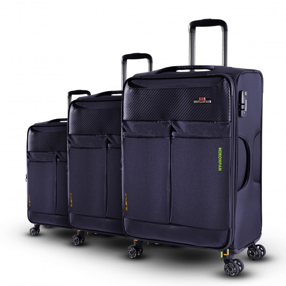 Комплект  из 3-х чемоданов MIRONPAN, универсальная модель с возможностью увеличения объема. Модель выполнена из высокотехнологичного полиэстера - современного прочного материала, для которого характер... Показать описаниены отличная износостойкость и влагостойкость.. Основное отделение закрывается на молнию с 2 бегунками. Внутри 2 отделения: одно - с  ремнями-фиксаторами, другое - с тканевой перегородкой на молнии и вместительным карманом-сеткой на молнии. На лицевой стороне предусмотрено дополнительное отделение и  карман закрываются на  молнии. Выдвижная ручка фиксируется в 2-х положениях. Сверху и сбоку предусмотрены дополнительные ручки для удобства переноски. 4 двойных колеса несъемные вращаются на 360°, позволяя чемодану двигаться легко и плавно. Чемодан оснащен кодовым замком. Характеристики модели:                                                                                                                                                                                                                                                                                                                                                              - объем 92 л,60л,39л; - 2 отделения; - 4-е двойных  колеса  со свободным вращением на 360°; несъёмные; - телескопическая ручка (фиксация в 3-х положениях); - кодовый замок; - возможность увеличения объёма. Высота*Ширина*Глубина L    75*47*28 см, вес - 3,7 кг, 28 дюйма M   67*42*25 см, вес - 3,0 кг, 25 дюйма S    60*38*22 см, вес - 2,5 кг, 20 дюйма