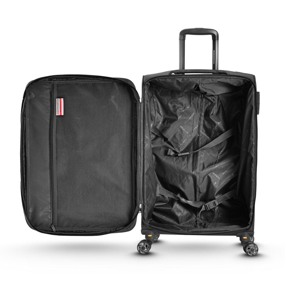 Комплект из 3-х чемоданов  MIRONPAN универсальная модель с возможностью увеличения объема. Модель в черный цвете обладает облегченным весом и выполнен из высокотехнологичного полиэстера - современного... Показать описание прочного материала, для которого характерны отличная износостойкость и влагостойкость. Основное отделение закрывается на молнию с 2 бегунками. Внутри 2 отделения: одно - с  ремнями-фиксаторами, другое - с тканевой перегородкой на молнии и вместительным карманом-сеткой на молнии. На лицевой стороне предусмотрено дополнительное отделение и  карман закрываются на  молнии. Выдвижная ручка фиксируется в 2-х положениях. Сверху и сбоку предусмотрены дополнительные ручки для удобства переноски. 4 двойных колеса несъемные вращаются на 360°, позволяя чемодану двигаться легко и плавно. Чемодан оснащен кодовым замком. Характеристики модели: - объем . L- 98,4 л., M- 59,6 л., S - 37,5 л.; - 2 отделения; - 4-е двойных  колеса  со свободным вращением на 360°; несъемные - телескопическая ручка (фиксация в 3-х положениях); - кодовый замок; - возможность увеличения объёма. L – ширина - 44 см; высота - 73 см; глубина - 21 см(с расширением 27 см), вес - 3,5 кг;  27 дюйма. M– ширина - 38 см; высота - 64 см; глубина - 19 см (с расширением 22 см), вес – 2,9 кг; 26 дюйма. S – ширина - 32 см; высота - 52 см; глубина - 16 см (с расширением 20 см), вес – 2,5 кг; 23 дюйма.