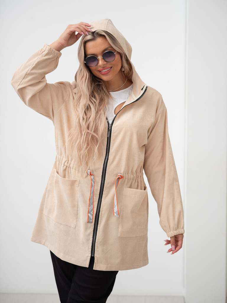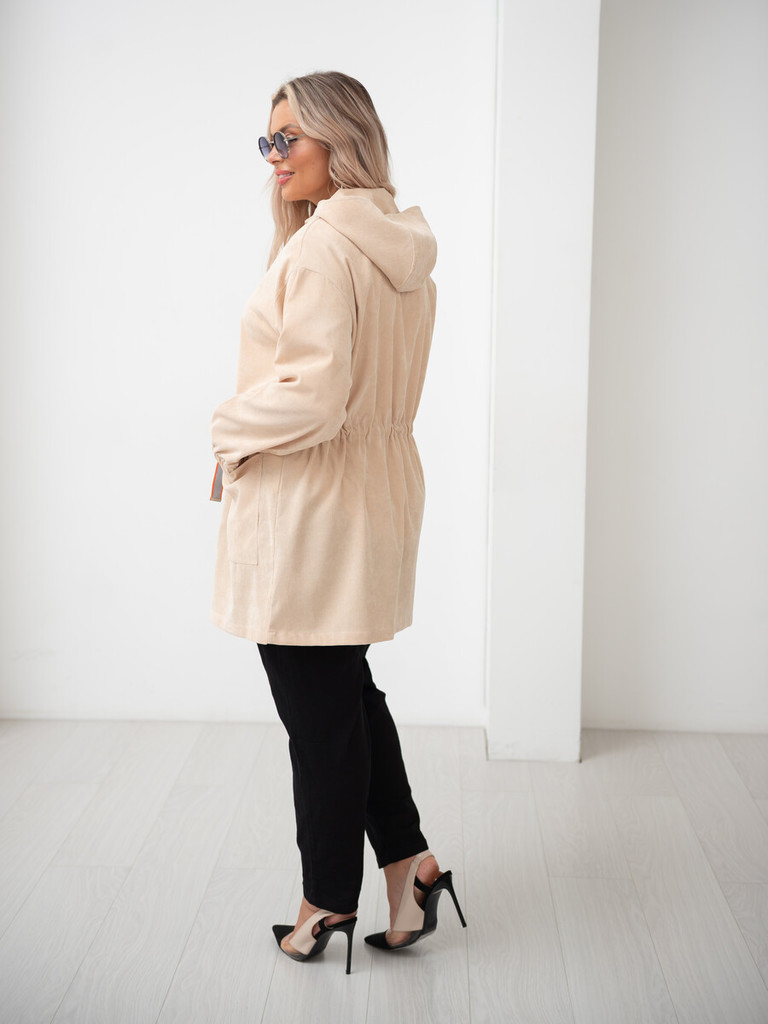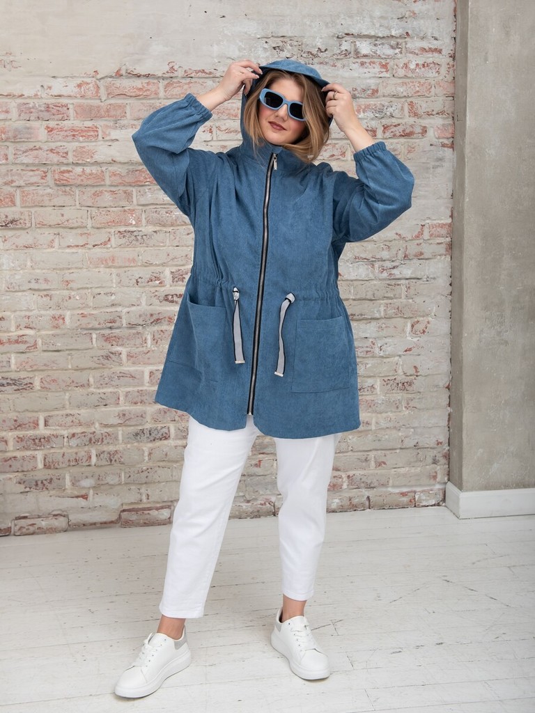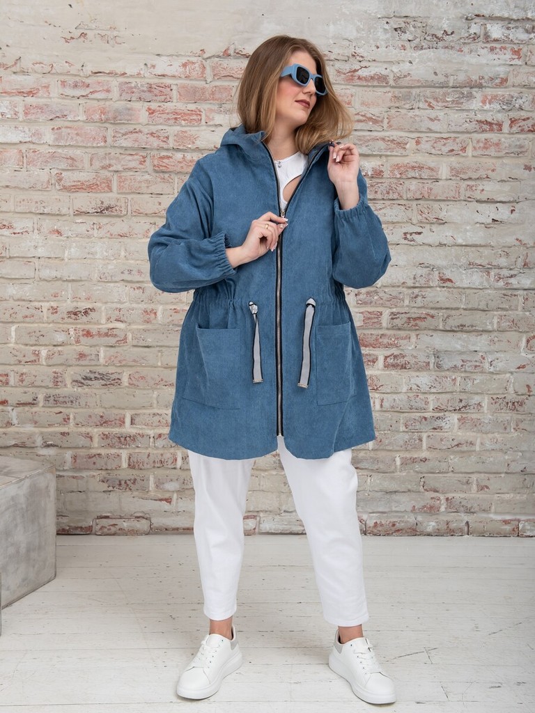 Стильный удлиненный жакет-ветровка свободного силуэта из вельветовой однотонной ткани без подклада. Круглый вырез горловины дополнен капюшоном . По переду - центральная застежка на тесьму-молнию. ... Показать описание; Длинные втачные рукава, с широкой резиной по низу. Модель с большими накладными карманами, удобно расположенными на линии бедер. По линии талии прилегание за счет кулиски с фиксаторами. Низ ровный. Ветровка станет отличным дополнением повседневного гардероба. Этот жакет идеально подойдет для полных женщин больших размеров. Универсальный дизайн делает изделие отличным выбором как для повседневных выходов, так и для активного отдыха на свежем воздухе. Накладные карманы добавляют функциональности и удобства, при эксплуатации. Мягкая текстура ткани приятна к телу.