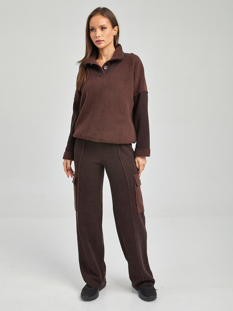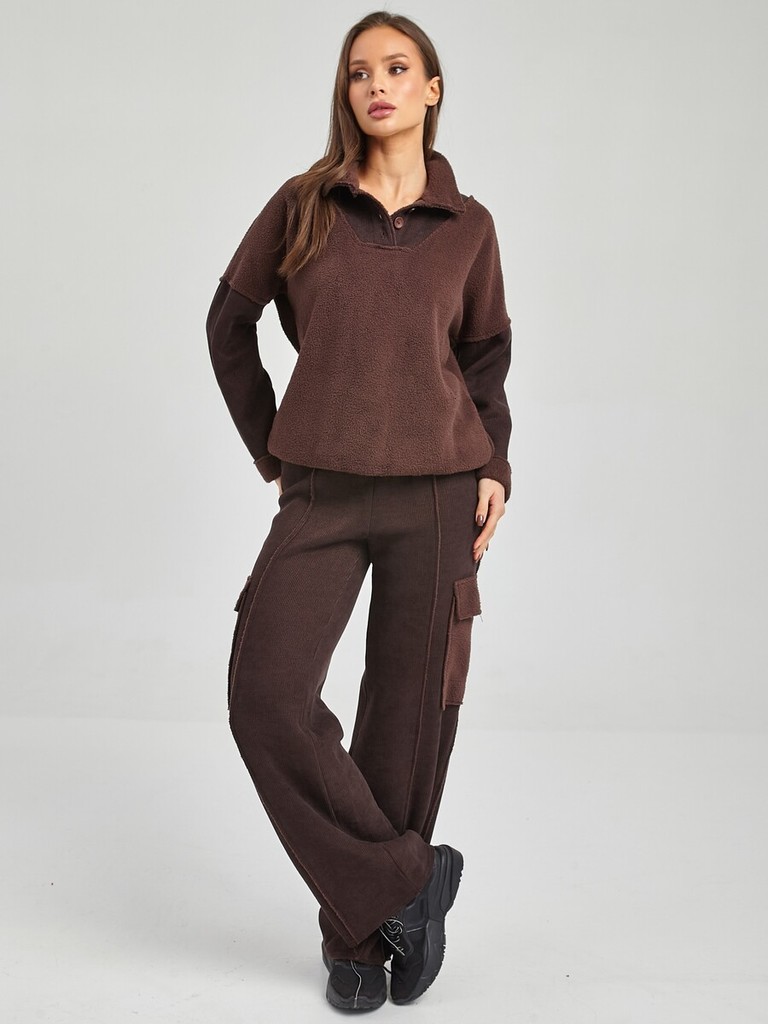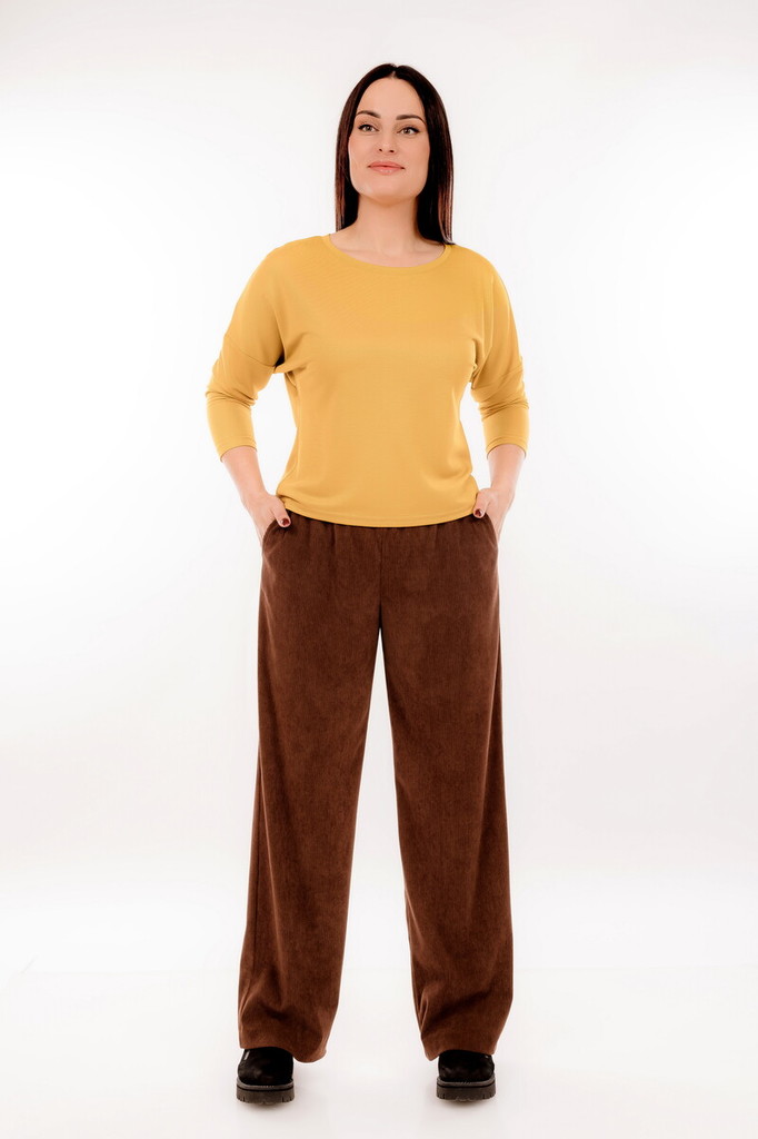 Широкие брюки неяркого коричневого оттенка длиной в пол – идеальный вариант для весеннего гардероба. Высокая посадка визуально удлиняет силуэт. Для изготовления модели с фигурной кокеткой на спинке и ... Показать описаниезакругленными боковыми карманами, как у джинсов, использовали мягкий микровельвет на основе вискозы. Застежка – гульфик, шлевки для кожаного ремня. На фото представлены с жилетом В-91 ВЛК(В4) и джемпером С-41 СКР(В4).