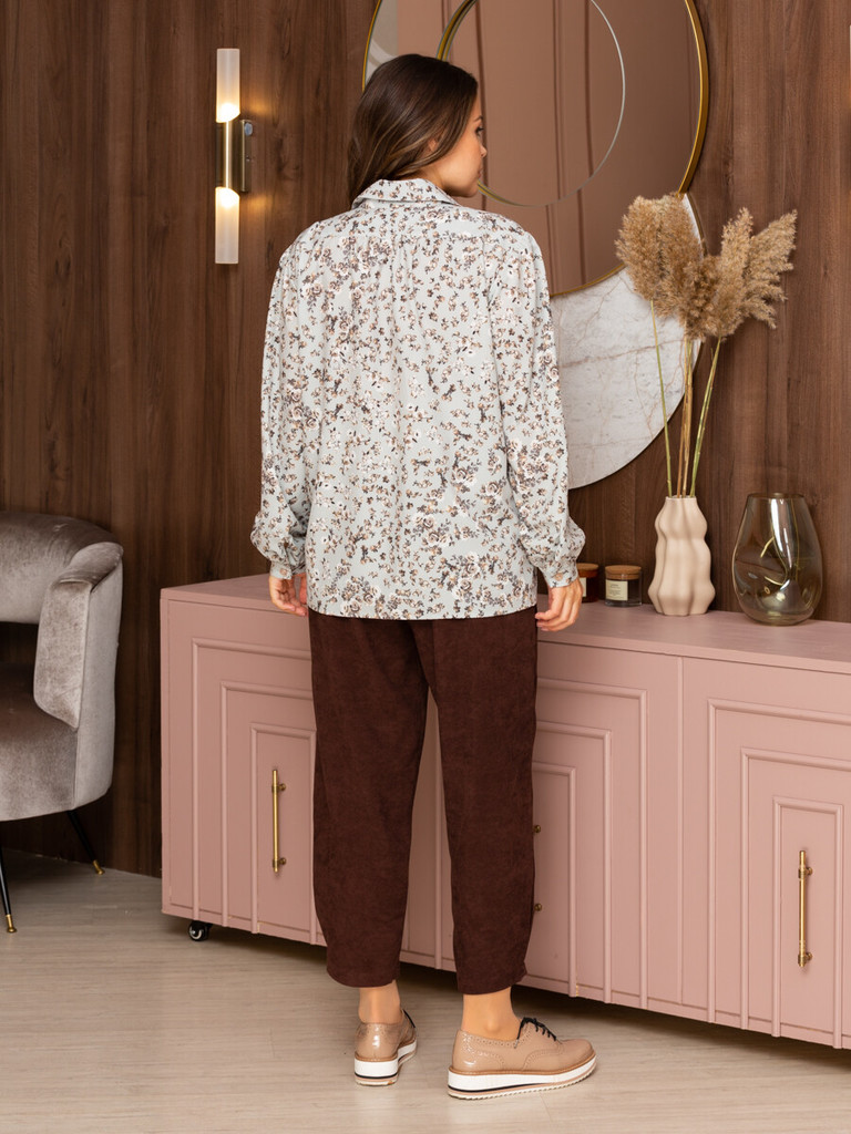 Повседневная блуза свободного силуэта, выполнена из вельветовой ткани . Блуза с отложным воротником, по переду с центральной застежкой на петли и пуговицы. . Спинка с отрезной кокеткой .Блуза с углубл... Показать описаниеенной проймой и удлиненной линией плеча. Рукав длинный заканчивается манжетом с застежкой на петлю и пуговицу. Блуза по переду с накладным карманом. Длина по спинке в 48 р-ре 72 см. Длина рукава от горловины 76 см