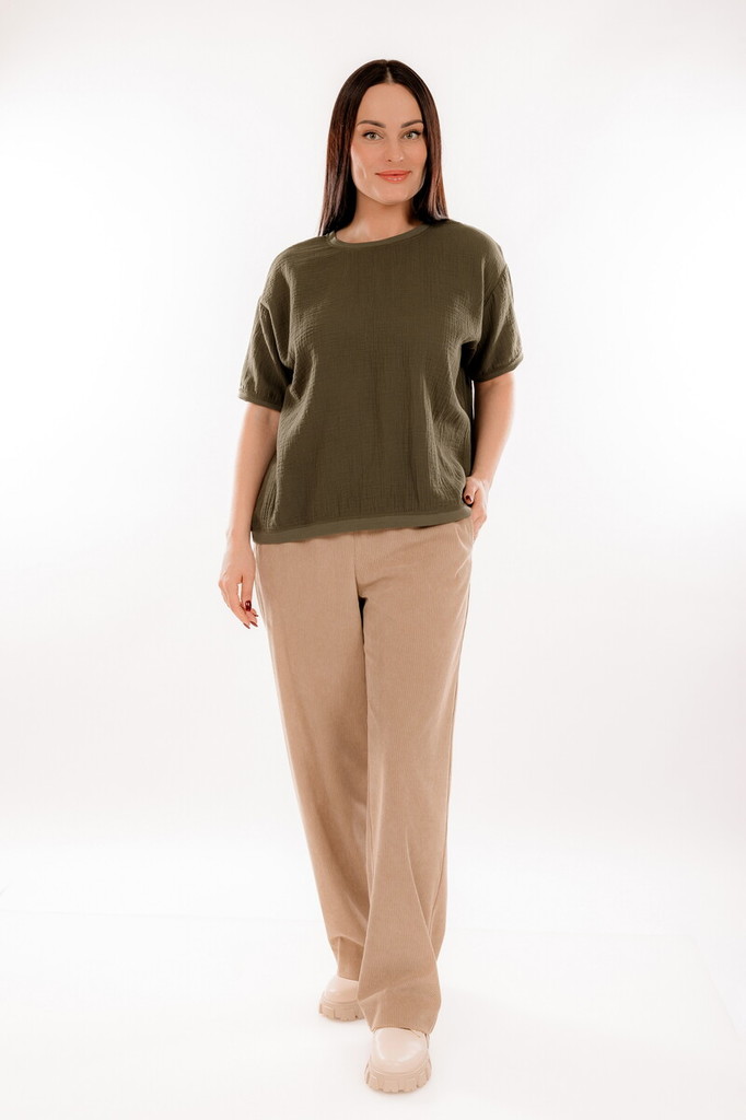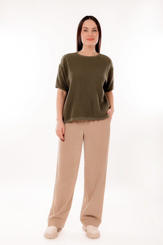 Практичные брюки свободного кроя из однотонной ткани. Модель имеет функциональные карманы в боковых швах. Комфортную посадку на талии обеспечивает притачной пояс с эластичной резинкой на спинке. Модел... Показать описаниеь без застежки. Рекомендуемая стирка при t не более 30°. Длина брюк по боковому шву: 42, 44, 46, 48 р , 50, 52 р - 106 см Длина брюк по шаговому шву: 42, 44, 46, 48 р ,50, 52 р - 81 см Рост фотомодели: 168 см Размер фотомодели: 42 Ткань: Вельвет