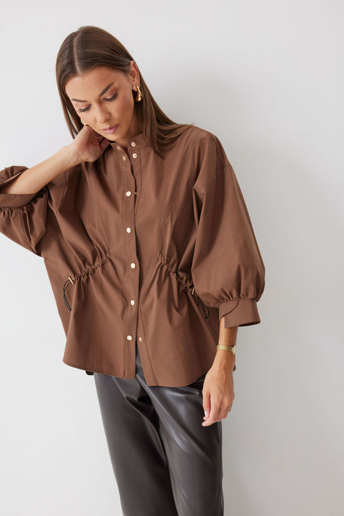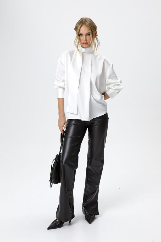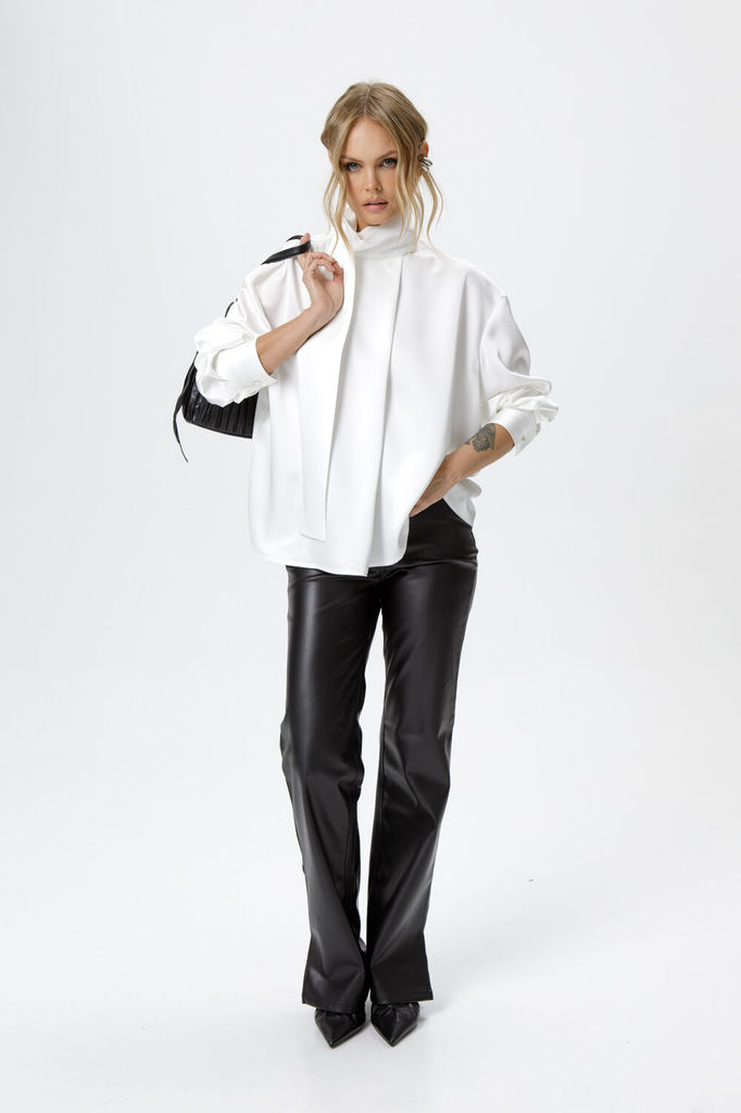Состав: Вискоза-48%; ПЭ-52%; Сезон: Осень-Зима Рост: 164 Страна бренда: Беларусь Состав: Вискоза-48%; ПЭ-52%; Струящаяся свободная блуза со стойкой-бантом. Детали: прямой силуэт, высокий воротник стой... Показать описаниека с широкими длинными завязками, блуза с глубокой складкой по переду, удлинённая линия плеча, рукава с притачными манжетами и застёжкой на пуговицу. Длина изделия по спинке около 61 см, длина рукава около 60 см