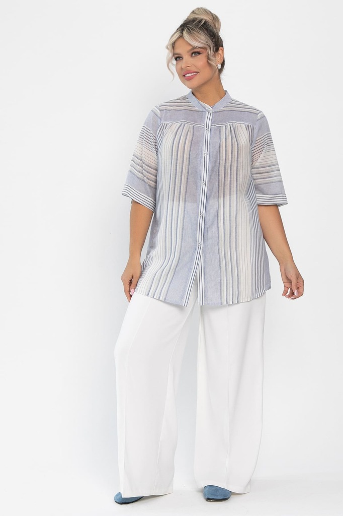 Состав: Хлопок-100%; Сезон: Лето Рост: 170 Страна бренда: Россия Состав: Хлопок-100%; Состав : 100% хлопок Материал : хлопок Цвет : Голубой Принт : полоска Силуэт : свободный Карманы : Отсутствуют Под... Показать описаниекладка : Отсутствует Вид застежки : пуговицы Декоративные элементы : отсутствуют Длина : 50-75 см, 52-78 см, 54-79 см, 56-80 см Отснято с джинсами Б13806-4М и с брюками Б12685-13 Блузка свободного кроя, изготовленная из хлопковой ткани с ярким принтом в виде полос, станет стильным дополнением к вашему гардеробу. Благодаря воротнику-стойке, она выглядит особенно элегантно. Эта блузка станет идеальным дополнением к вашему образу, если вы наденете её поверх топа или футболки. Она отлично подойдёт для прогулки или встречи с подругами. Блузка создаст гармоничный и завершённый образ, при этом сохраняя ощущение свободы и комфорта в течение всего дня. Внимание! Рекомендуем ориентироваться на размерную сетку и выбирать свой привычный размер, согласно размерной таблице. *Допуск отклонения длины при массовом производстве 1-3 см является нормой.