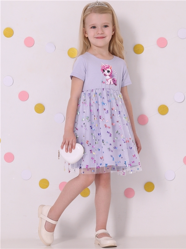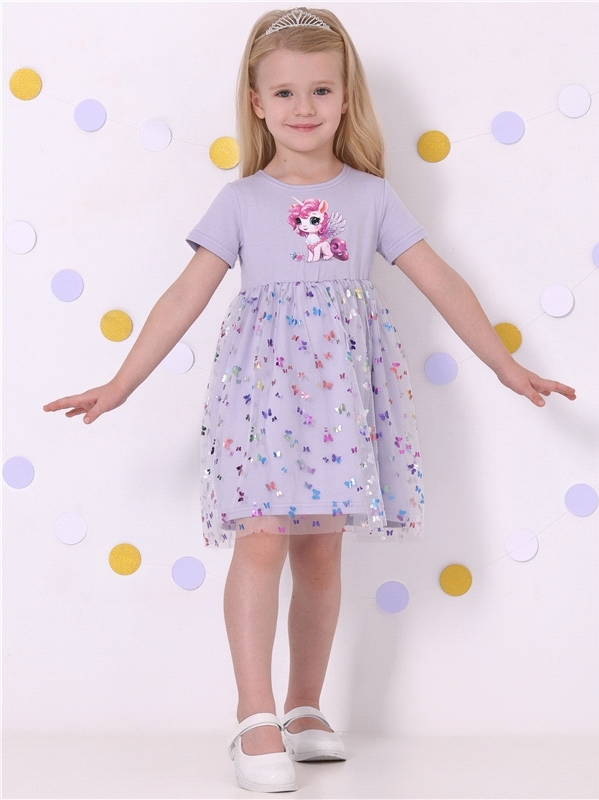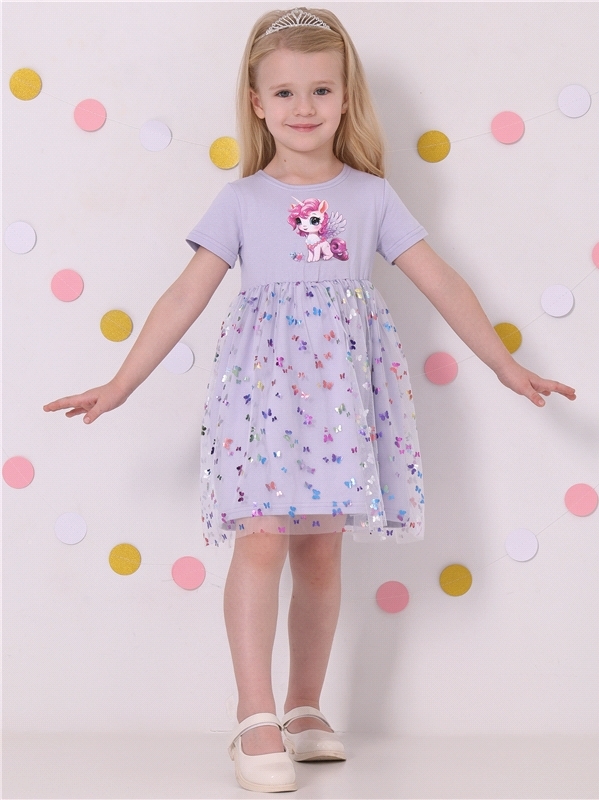 Нарядное платье из кулира – легкого хлопкового полотна с лайкрой. Изделие трапециевидного силуэта, отрезное по линии талии, короткие рукава со спущенной линией плеча, юбка продублирована присборенной ... Показать описаниепо линии талии мягкой сеткой, украшено стильным принтом с глиттером. Уход: только деликатная стирка при температуре 40 градусов, без предварительного замачивания. Изделия с печатью и декором перед стиркой необходимо вывернуть на изнаночную сторону. Состав: кулир с лайкрой / хлопок 90% + лайкра 8% + пэ 2%.