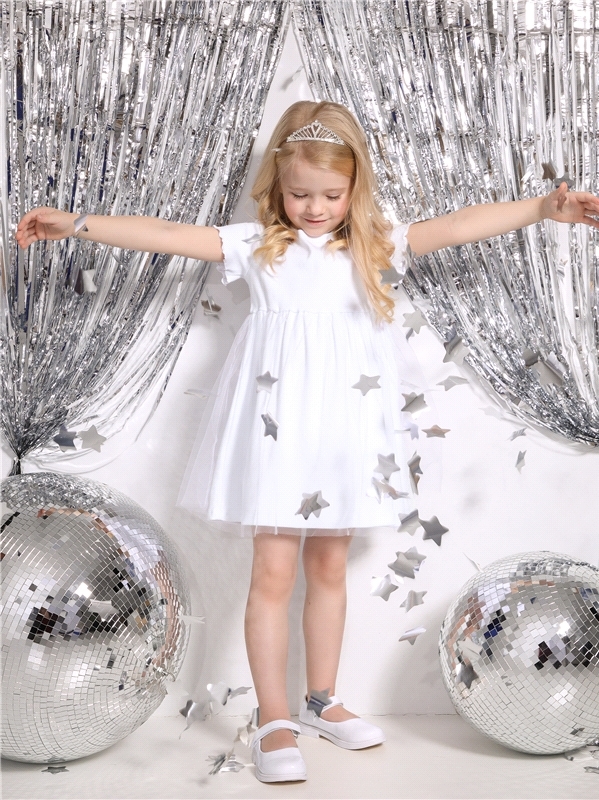 Нарядное платье для девочек из тонкого хлопкового полотна с лайкрой. Изделие отрезное по линии талии, с объемными двойными рукавами-фонариками и пышной юбочкой из сетки. Спинка с V-образным вырезом, в... Показать описаниеыполнена на запАх. Сеточка украшена серебристыми звездочками. Уход: только деликатная стирка при температуре 40 градусов, без предварительного замачивания. Состав: кулир с лайкрой / хлопок 90% + лайкра 8% + пэ 2%.