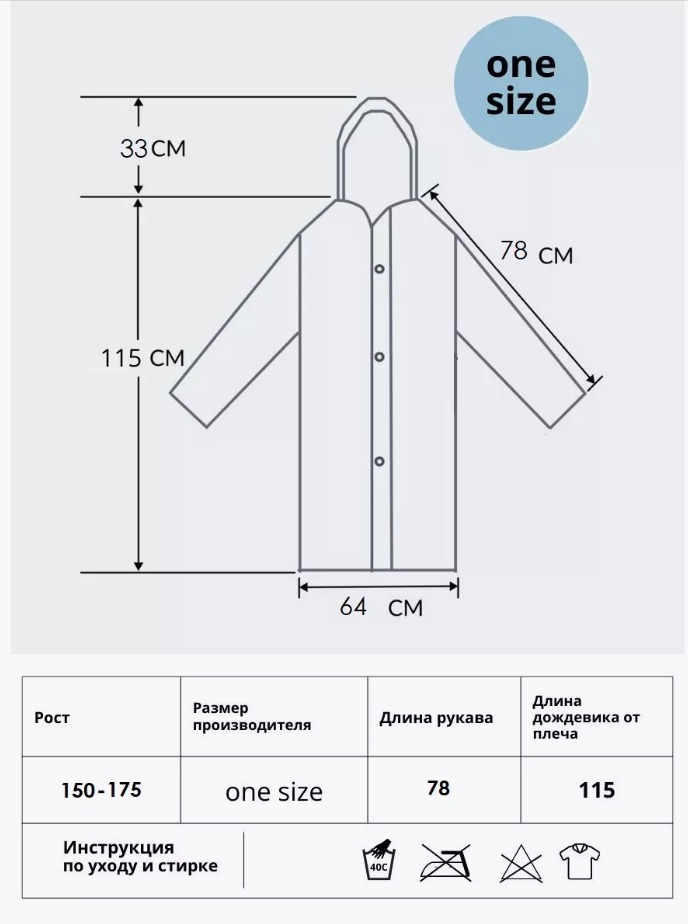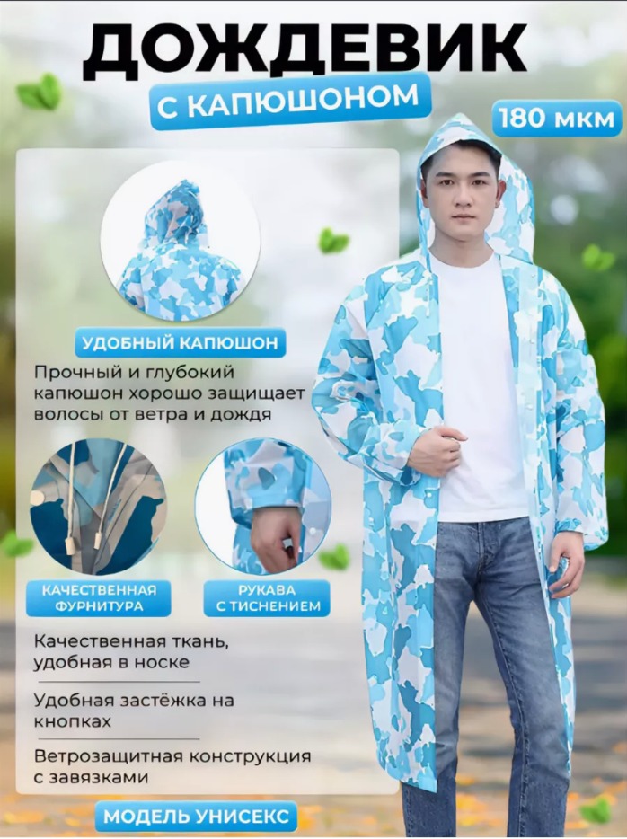 Дождевик на кнопках с капюшоном стягивается шнурком, рукава с тиснением. Выполнен из экологически чистого материала EVA 180мкм. Этот материал превосходит полиэтилен по легкости и эластичности при низк... Показать описаниеих температурах, не вызывает аллергических реакций. Без запаха и полностью водонепроницаем, произведен методом спайки. Дождевик унисекс подойдет как мужчине так и женщине надежно защитит от промокания любую одежду.