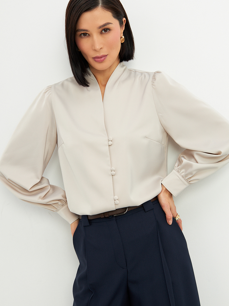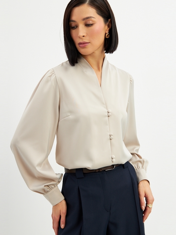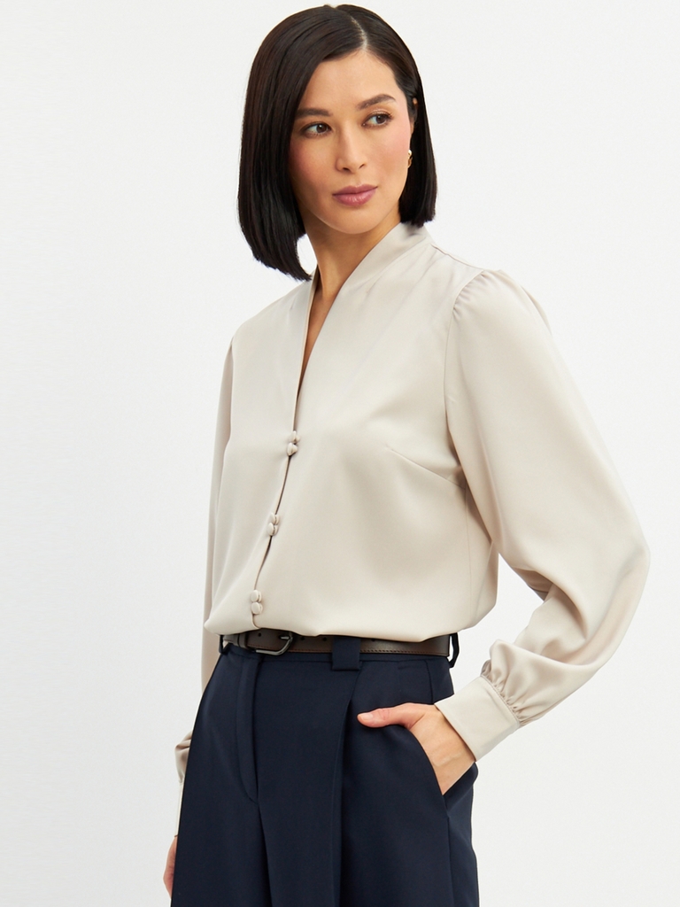 Состав: 45% полиэстер35% вискоза, 20% шелк. Состав: Вискоза, Полиэстер, Шелк. Длина по спинке: 63 см. Длина рукава: 68,6 см. Принт: Однотонный. Рукав: Длинный. Сезон: Осень, Весна, Зима. Силуэт: Прямо... Показать описанией. Стиль: Повседневный, Деловой, Вечерний. Тип горловины: V-образный. Блузка прямого силуэта. Из однотонной блузочной ткани. Воротник-стойка с V-образным вырезом.Рукав втачной, длинный со сборкой по плечу и по низу, на манжете. Застежка на навесные петли и пуговицы на ножке. Рост модели 170 см. Изделие на модели 42 р-ра. Длина изделия по спинке 63 см. Подробное описание: https://seller.tantino.ru/bluzka-od-735-9-bezhevyj.html