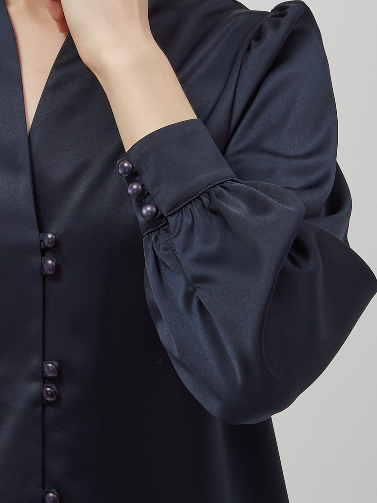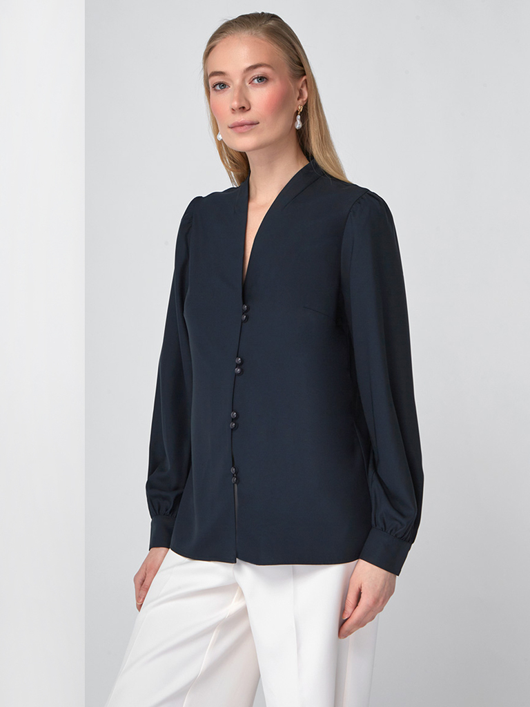 Состав: 45% полиэстер, 35% вискоза, 20% шелк. Состав: Вискоза, Полиэстер, Шелк. Длина по спинке: 63 см. Длина рукава: 68,6 см. Принт: Однотонный. Рукав: Длинный. Сезон: Осень, Весна, Зима. Силуэт: Пря... Показать описаниемой. Стиль: Повседневный, Деловой, Вечерний. Тип горловины: V-образный. Блузка прямого силуэта. Из однотонной блузочной ткани. Воротник-стойка с V-образным вырезом.Рукав втачной, длинный со сборкой по плечу и по низу, на манжете. Застежка на навесные петли и пуговицы на ножке. Рост модели 170 см. Изделие на модели 42 р-ра. Длина изделия по спинке 63 см. Подробное описание: https://seller.tantino.ru/bluza-s-vyrezom-.html